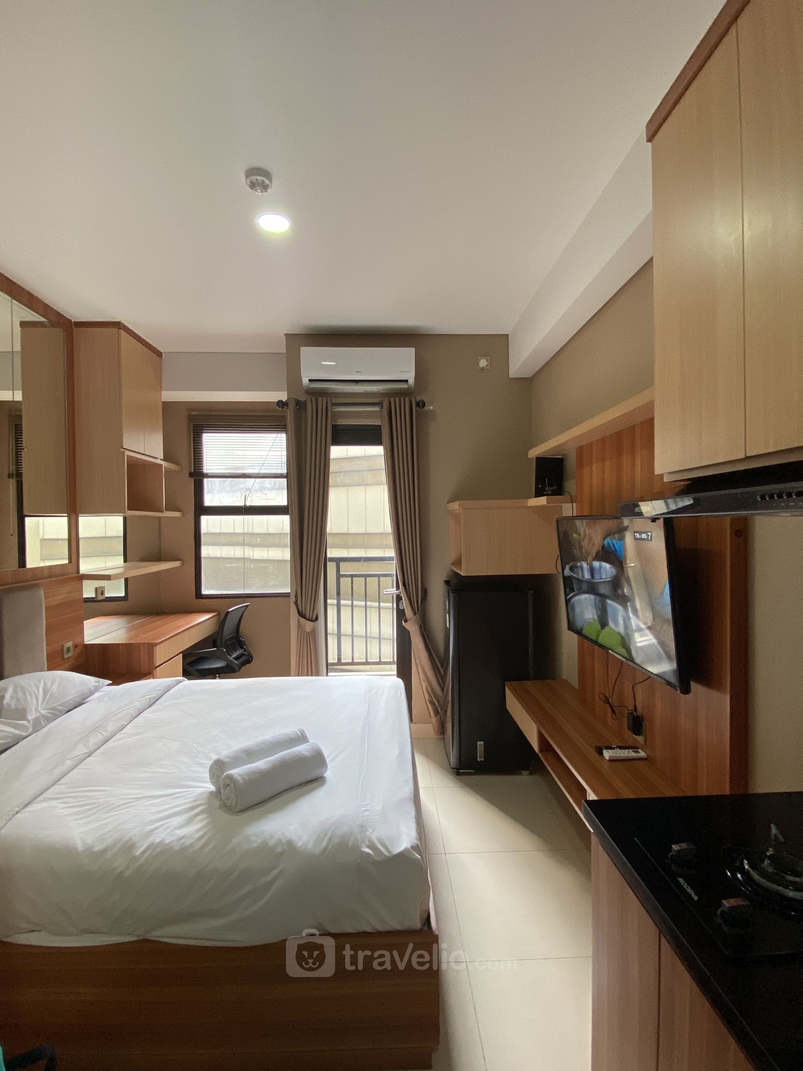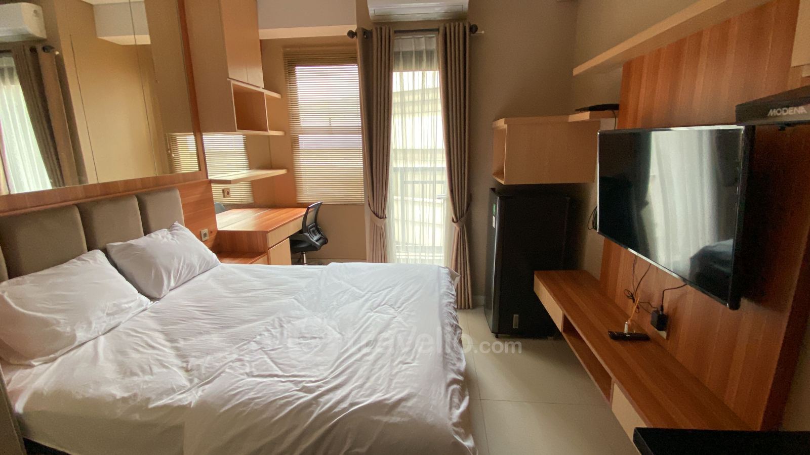This particular Studio apartment unit is perfect either for holiday or business trip. In addition, the unit has a width of 22.75 square meters. The unit is equipped with Queen Bed (160x200) which covered with a high quality linen. This unit is decorated with a touch of Modern to make you feel relax and comfortable. Another thing that worth noticing, this unit has a various amenities to make your staying experience even more enjoyable, such as water heater. This apartment unit is available for daily, monthly, and yearly booking. From the 12 floor, you can enjoy a stunning City View.