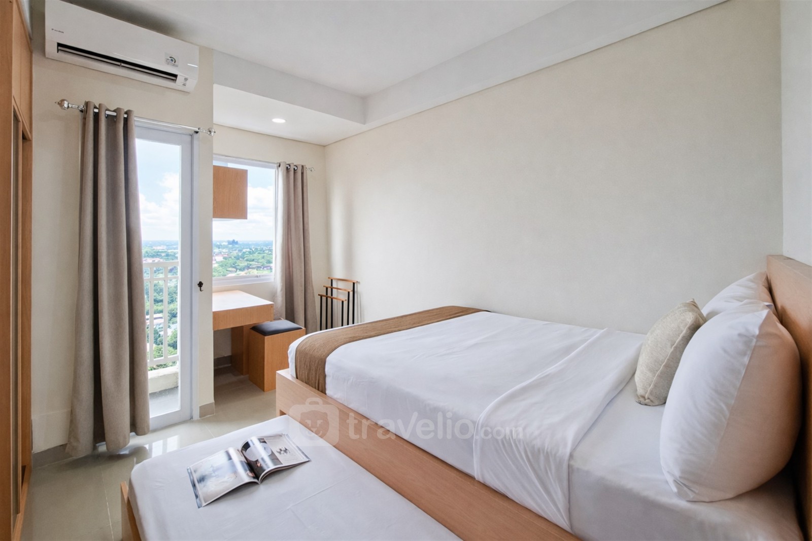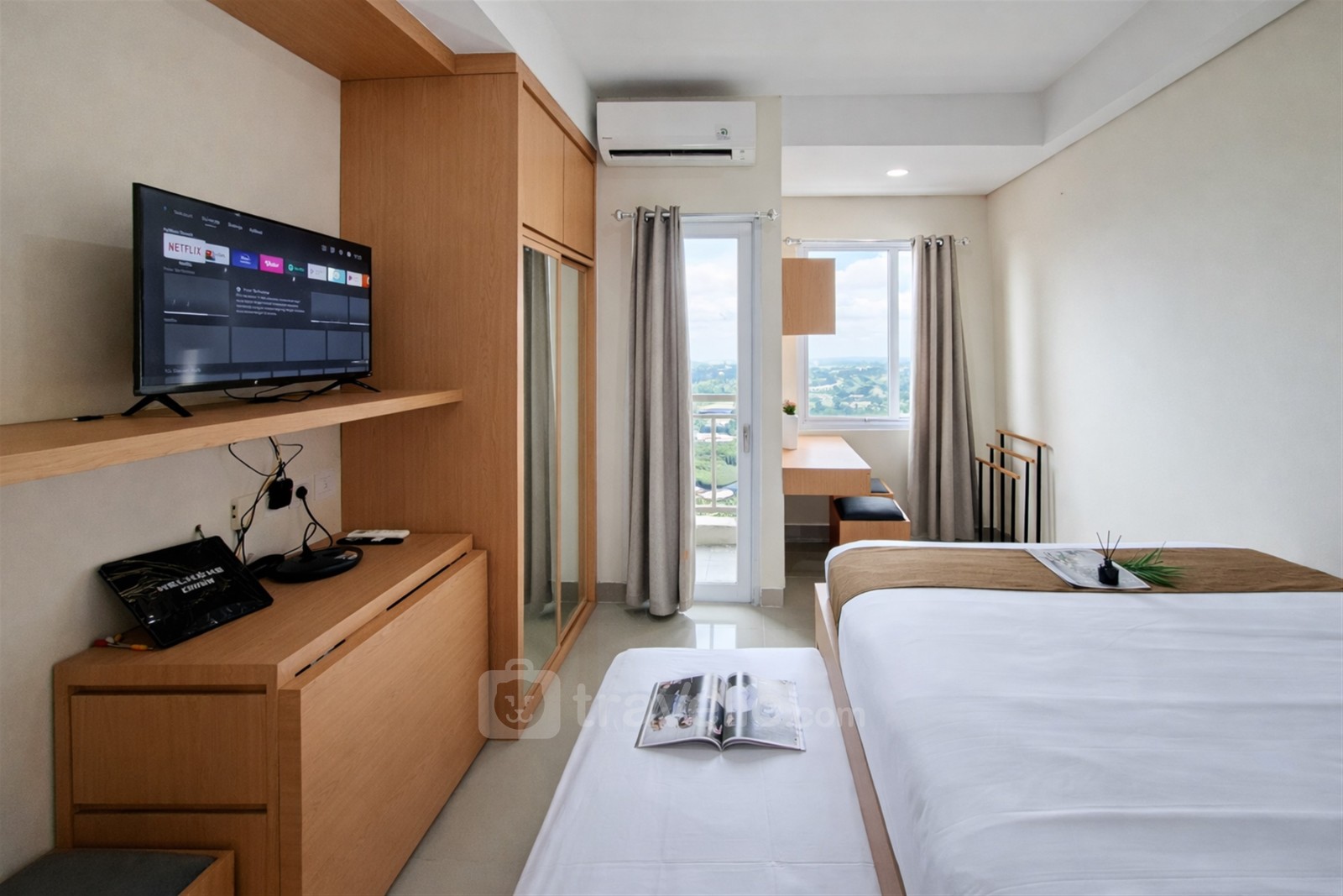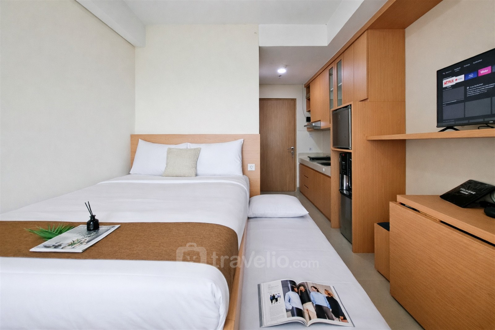 Stay in a practical studio apartment, 23.85 sqm, featuring a trundle bed (double bed with an underbed single bed) that comfortably accommodates up to 3 guests. This unit is suitable for students, small families, or travelers looking for convenient accommodation in the BSD City area, Tangerang. Its location provides easy access to universities, business districts, healthcare facilities, and transportation hubs.
