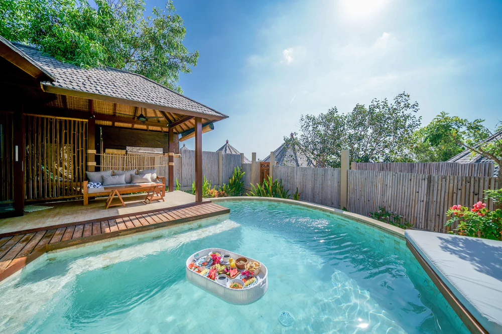 So beautiful view! Begitulah kira-kira kalimat yang bakal terucap begitu kamu tiba di penginapan satu ini. Meskipun kamu perlu keluar kamar untuk menikmati pemandangan laut biru yang sangat cantik, tapi dijamin kamu nggak akan bosan dan menyesal. Kamu bisa sambil melakukan berbagai kegiatan, seperti dinner romantis dengan sunset view misalnya. Tapi, nggak cukup dengan pemandangan yang indah, villa atau kamar yang akan kamu tempati pun nggak kalah sweet-nya, lengkap dengan private pool.