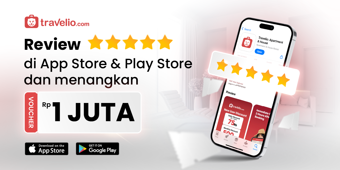Yuk, bagikan pengalaman menginap di Travelio versi kamu melalui Play Store atau App Store dan dapatkan kesempatan menang voucher Rp1 juta!