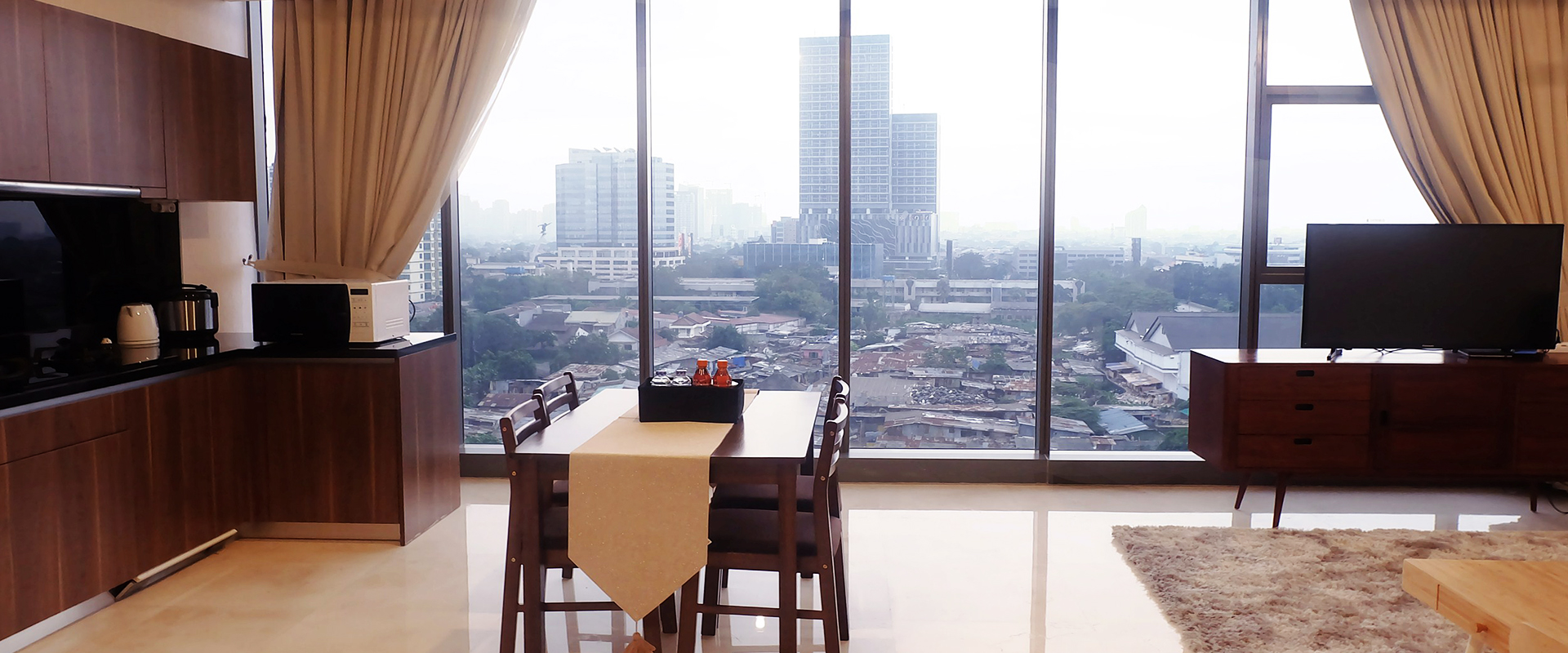 Hmm… kalau yang ini mewah parah! Luas nya kebangetan, interiornya luxury banget, nyaman, dan yang pasti jendelanya juga besar. Unit di area Dharmawangsa ini jadi favorit para expat dan keluarga, karena mewah dan luas bisa untuk 8 orang, tapi harganya masih masuk akal, bahkan lebih hemat jauh jika dibanding memesan kamar hotel berbintang yang per malam nya 1 jutaan sampai 2 jutaan hanya kamar saja untuk 2 org.
