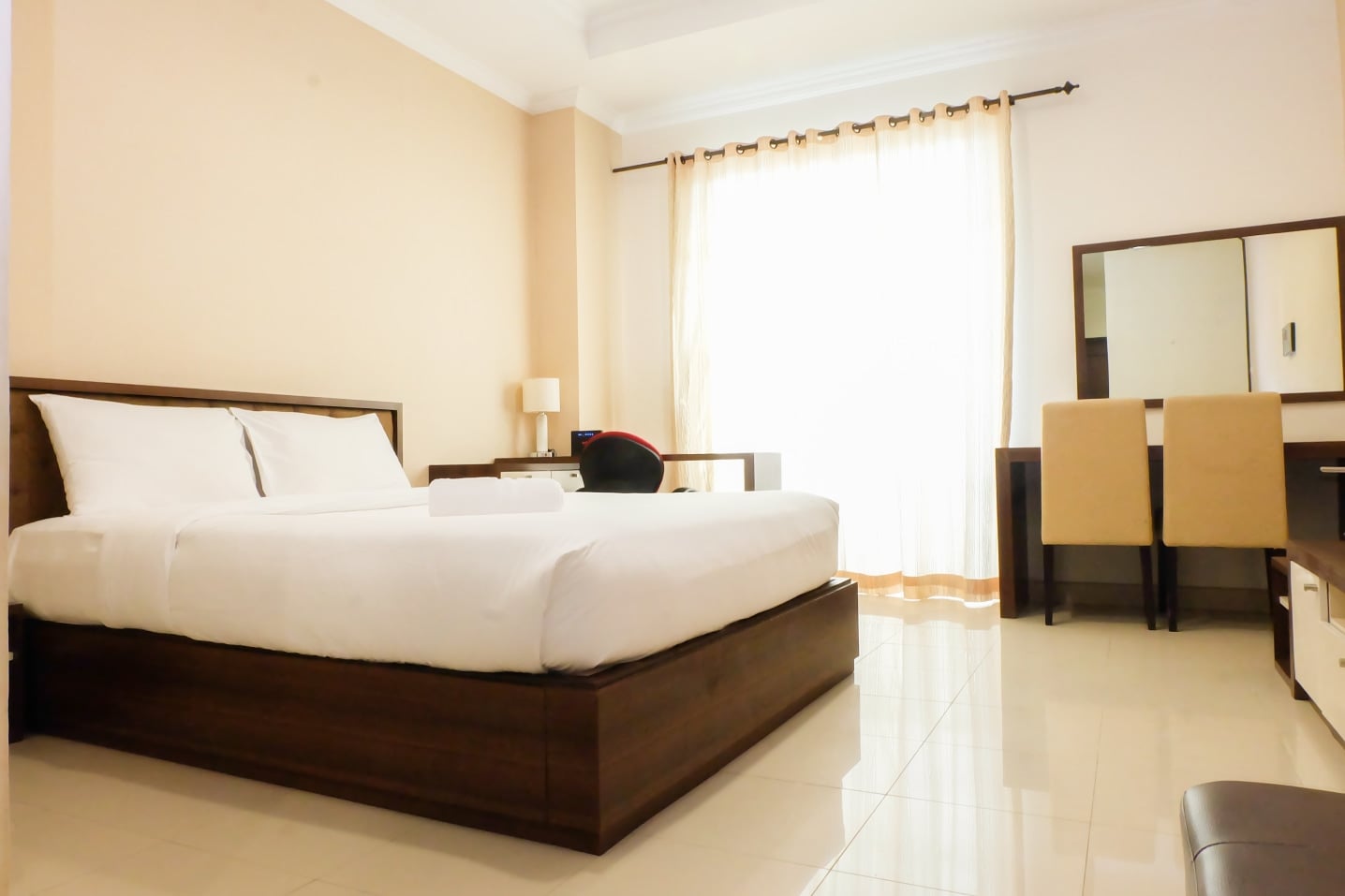 Hunian apartemen ini bertipe studio yang terletak di lantai 32, tower Albergo gedung Bellezza Apartment. Ruangan apartemennya juga terlihat menarik dengan desain minimalis modern. Unit apartemen ini memiliki warna dinding yang berwarn krim terang dan lembut, sehingg unit ini terlihat jauh lebih terang dan bersih, dilengkapui pula dengan dominan perabotan yang berwarna cokelat. Saat Anda masuk kedalam apartemen, terlihat tempat tidur berukuran queen untuk menunjang kenyamanan Anda selama beristirahat dan dibalut dengan linen kualitas hotel berbintang untuk semakin memaksimalkan waktu istirahat Anda.