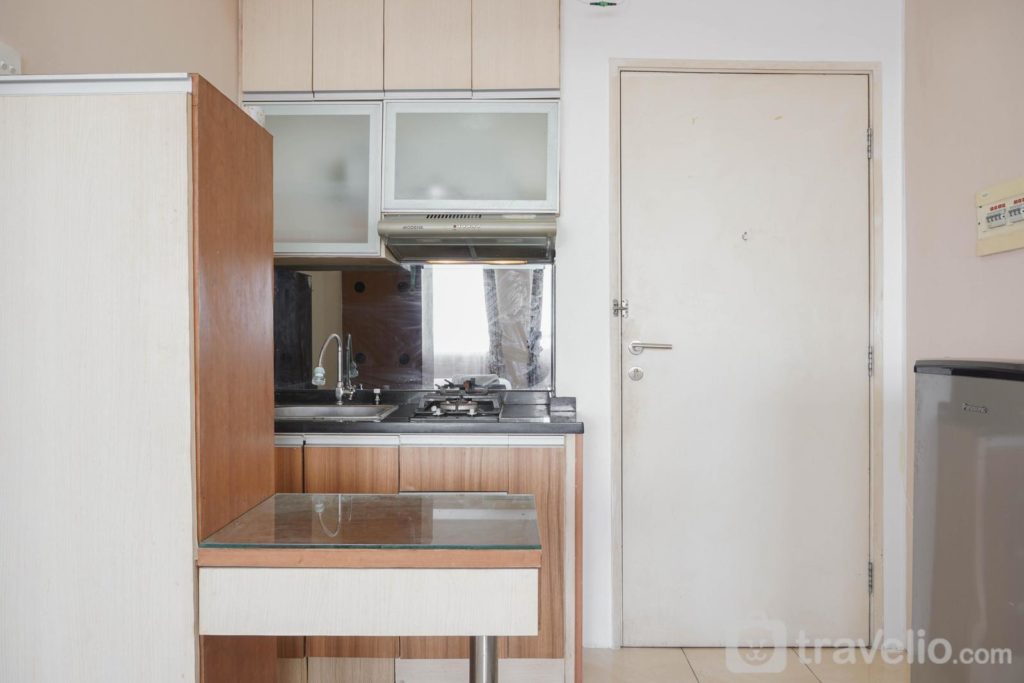 Seperti yang sudah disinggung sebelumnya, bahwa umumnya ukuran apartemen tipe studio berada diangka kisaran 18-19 m2. Sebagai bentuk gambaran jelasnya, unit di Apartemen Tree Park City BSD ini bisa jadi salah satu contoh dengan luas 18,14 m2. Namun unit ini mampu memaksimalkan ruangan dengan baik. Mulai dari tempat tidur berukuran 160×200 cm (queen bed) yang sekaligus jadi ruang tengah, kabinet TV, dapur, dan sedikit space untuk satu meja dan kursi yang bisa difungsikan sebagai meja makan maupun meja belajar. Memang tampaknya lebih sempit karna ruangan yang terbatas. Namun balik lagi, tipe studio memang diperuntukkan untuk satu sampai maksimal 2 orang saja. Dengan penataan dan pemaksimalan ruangan, tentu akan lebih nyaman meskipun terbatas ruang geraknya.