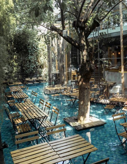 Cafe hits satu ini pasti sudah banyak yang tahu. Pasalnya tempat ini ramai menjadi perbincangan akan konsepnya yang menarik banyak orang untuk mencoba. Mereka memberikan kamu pengalaman makan sambil bersantai di dalam kolam. Beberapa kursi dan mejanya ditempatkan di dalam air layaknya kolam renang. Meskipun tidak terlalu dalam, tetapi kamu tetap harus melepas alas kaki sekaligus mengangkat sedikit bawahanmu (celana/rok) supaya tidak basah terkena air. Di sekitaran kolamnya juga dihiasi dengan tanaman vertikal yang akan menambah hawa sejuk dan tenang saat berada di sana. Dengan begini kamu bisa lebih rileks menghabiskan waktu sambil menikmati hidangan yang kamu pesan.