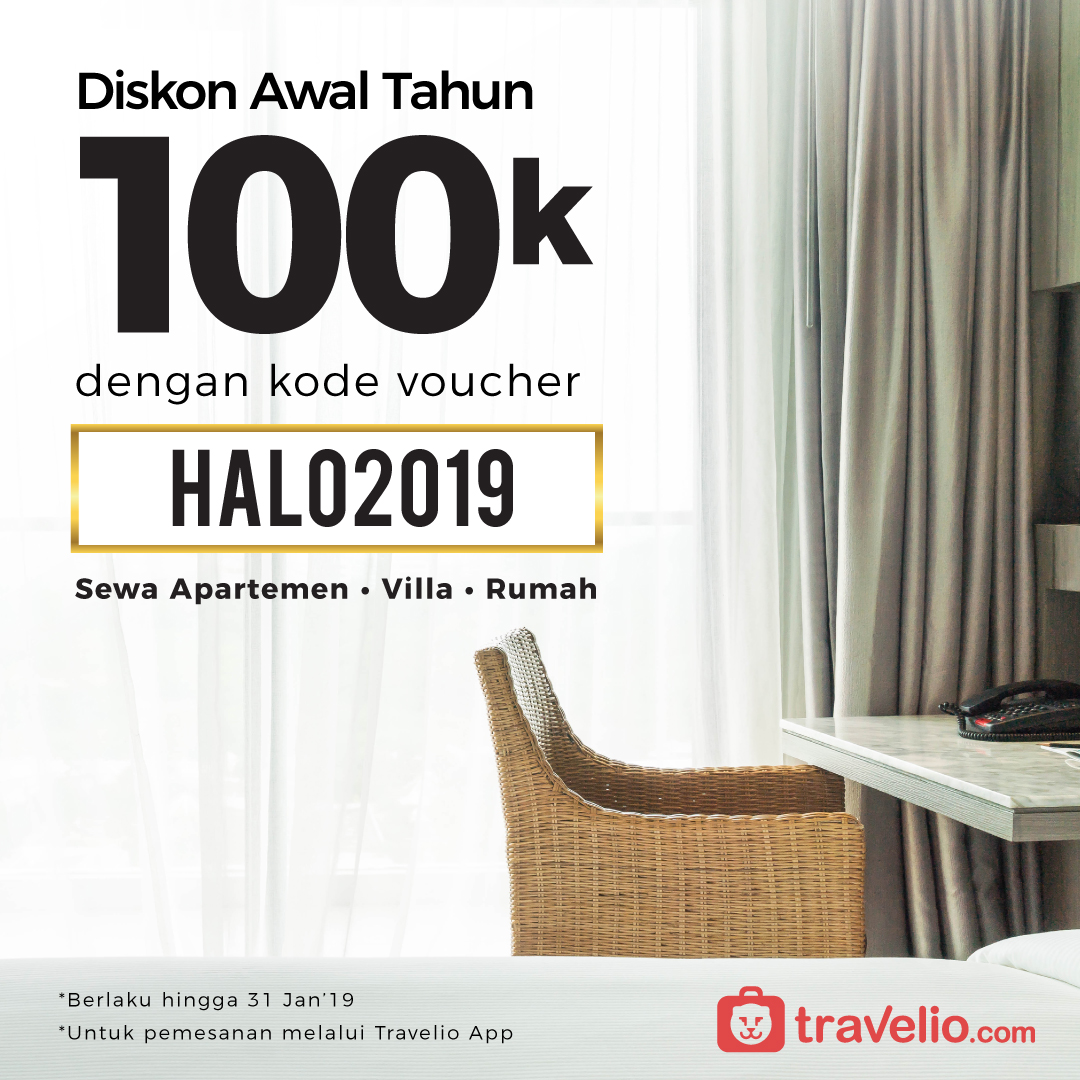 Ayo rayakan awal tahun 2019 ini bersama Travelio. Ada Promo loh hingga 100 Ribu di Januari 2019 ini. Booking sekarang jangan sampai menyesal karena promonya hanya berlaku di bulan ini saja. Yuk install dan booking apartemen untuk menikmati awal tahun kamu bersama keluarga atau temanmu sekarang di Travelio app