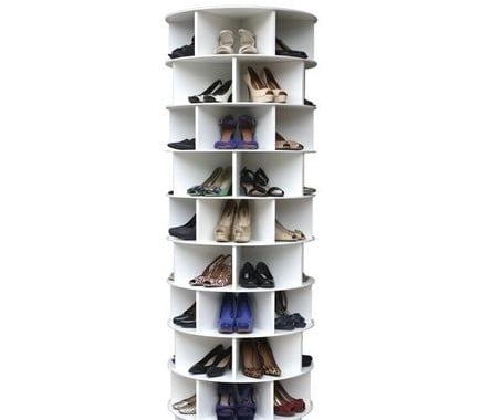 Penyimpanan sepatu dengan bentuk melingkar dan dapat diputar ini memiliki sekat-sekat di sekelilingnya, yang mana mampu menampung beberapa sepatu dalam satu wadah saja. Rak sepatu ini hanya perlu sedikit space pada sudut ruangan.