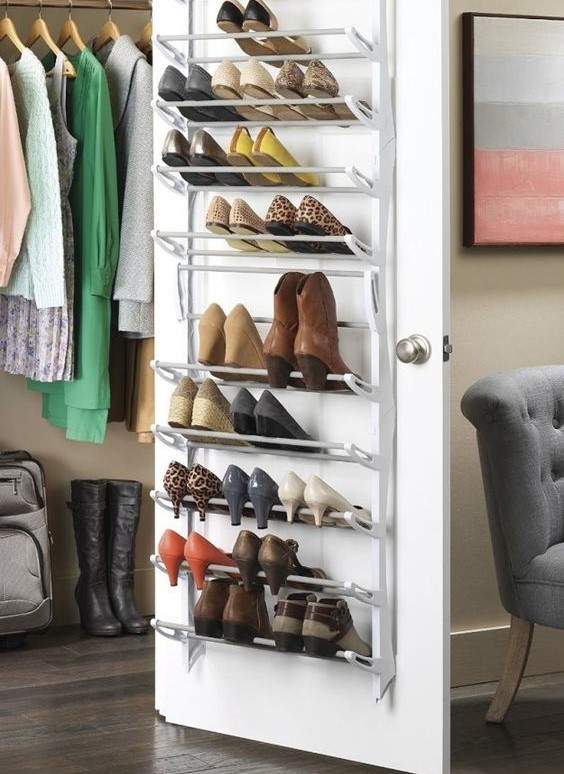 Sama halnya dengan rak sepatu yang merekat pada dinding, penyimpanan di balik pintu juga bisa menjadi solusinya. Penggunaan bahan besi atau baja yang dirakit dan disesuaikan dengan ukuran yang dibutuhkan, lalu direkatkan pada bagian dalam sisi pintu. Sehingga tidak akan memakan ruang untuk menyimpan koleksi sepatu anda.