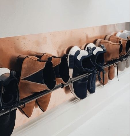 Rekomendasi pertama untuk tempat menyimpan sepatu yang hemat ruang ialah pada rak yang melekat pada dinding. Penggunaan baja atau besi, dan juga kayu yang dimodifikasi sedemikian rupa lalu direkatkan ke salah satu dinding, mampu meminimalisir pemakaian banyak ruang pada rumah. Biasanya bahan dan model yang digunakan ini cocok untuk tema hunian industrial.