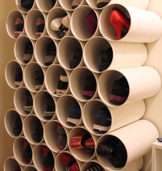 Jika anda memiliki pipa paralon bekas pakai atau bahkan tidak terpakai, jangan dibuang ya! Coba dirakit menjadi rak sepatu yang unik dan menarik tentunya. Pemilihan pipa paralon berdiameter besar dapat dipotong menjadi beberapa buah. Lalu nantinya ditempelkan pada sisi-sisi dinding dan disusun sedemikian rupa sesuai keinginan masing-masing.