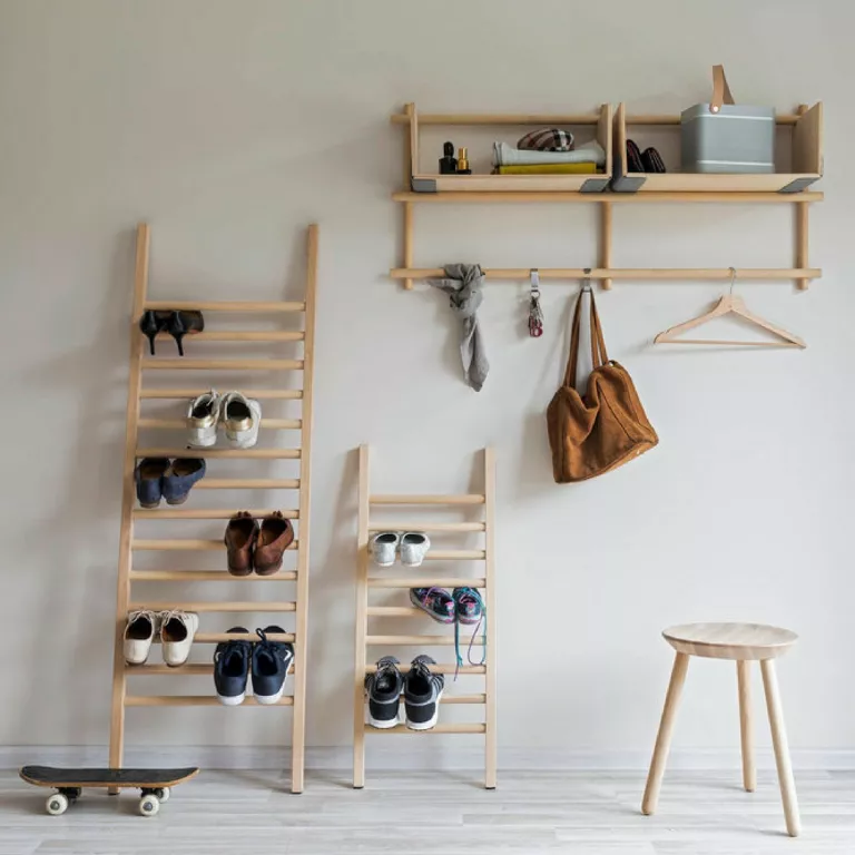 Memanfaatkan sedikit ruang vertikal pada sudut ruangan untuk meletakkan rak sepatu dengan model tangga kayu. Penggunaan rak sepatu macam ini menjadi salah satu alternatif dalam menghemat ruang. Sebab penempatan sepatu yang vertikal seperti ini tidak akan memakan banyak tempat pada sisi kanan dan kiri ruangan.
