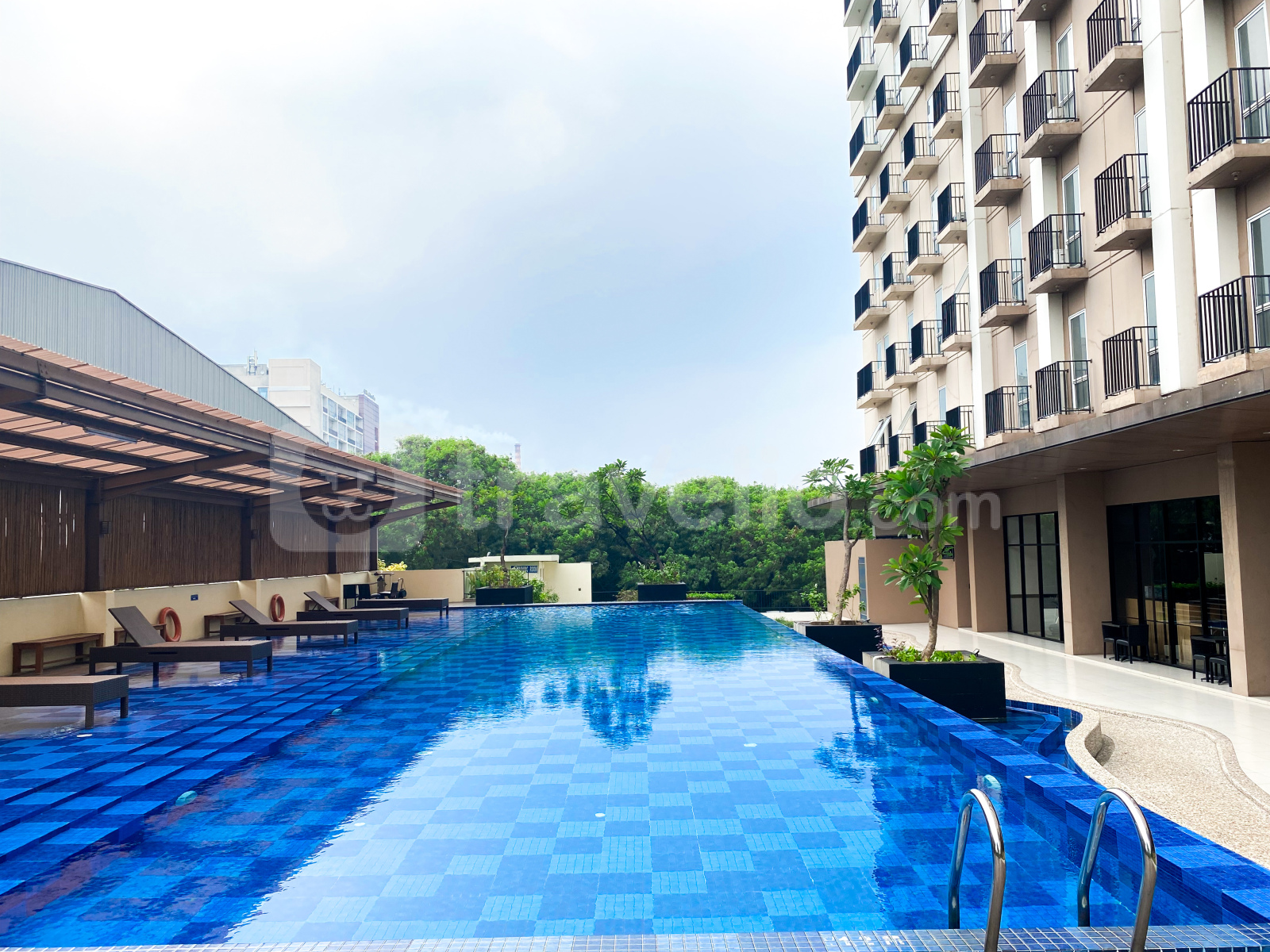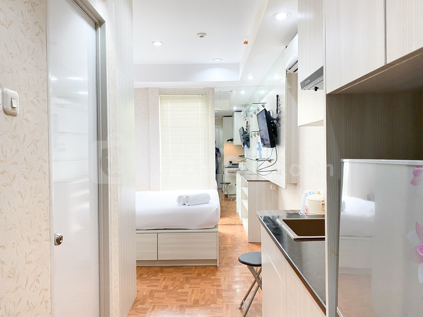 Introducing the Comfortable and Minimalist Studio at Azalea Suites Apartment By Travelio. This cozy studio apartment offers a comfortable living space of 22 sqm, located within the modern Azalea Suites Apartment. The studio apartment boasts a minimalist design, providing residents with a serene and clutter-free environment. Equipped with essential amenities including a TV, refrigerator, and water heater, residents can enjoy both comfort and functionality within their living space. Residents can also take advantage of the building's facilities, including 24-hour security for peace of mind, access card entry for added security, a cafe for casual dining, an elevator for convenience, a fitness center for staying active, a jogging track for outdoor exercise, a laundry service (available at an additional charge), a restaurant for dining options, a supermarket for grocery shopping, and a swimming pool for relaxation and recreation.
