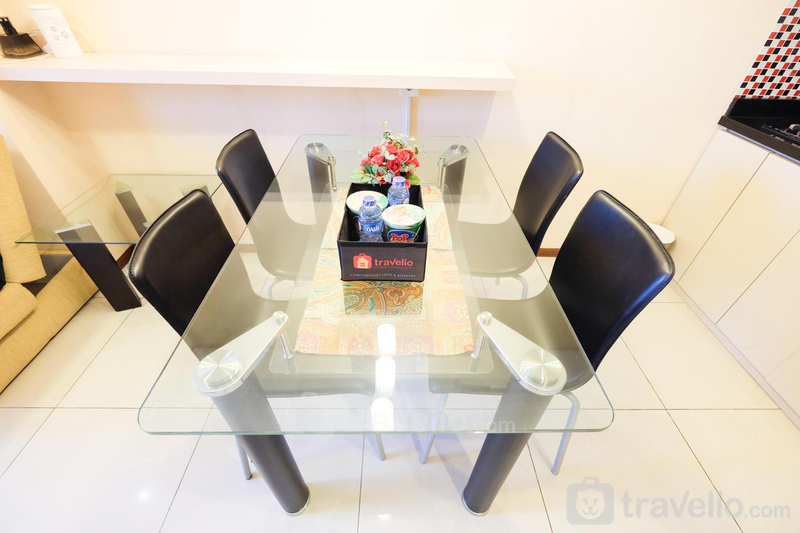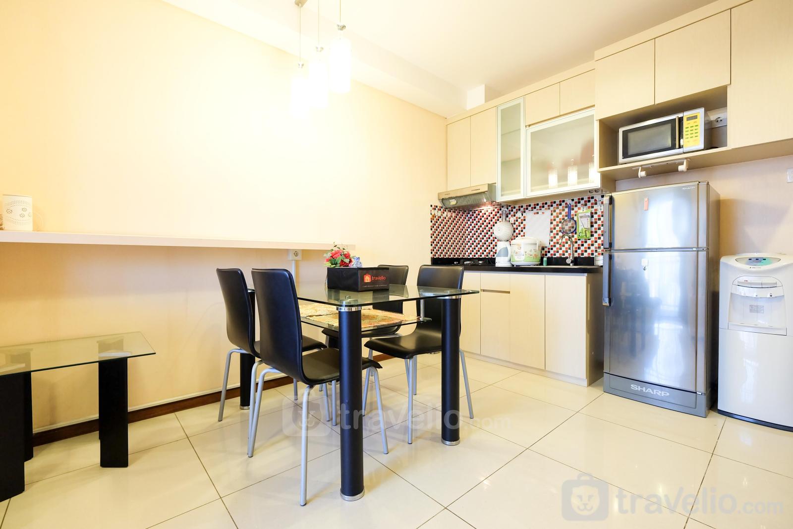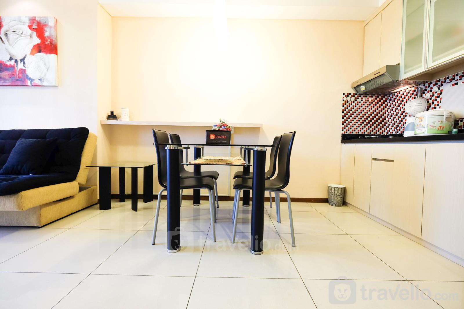 This apartment has wood-based furniture combined with cream-colored walls make this room feels comfortable. Your rest will be maximized with a queen-size bed wrapped with quality linen. There is air conditioning in this room that supports your rest. To support your activities, this apartment provides TV and free wifi access.