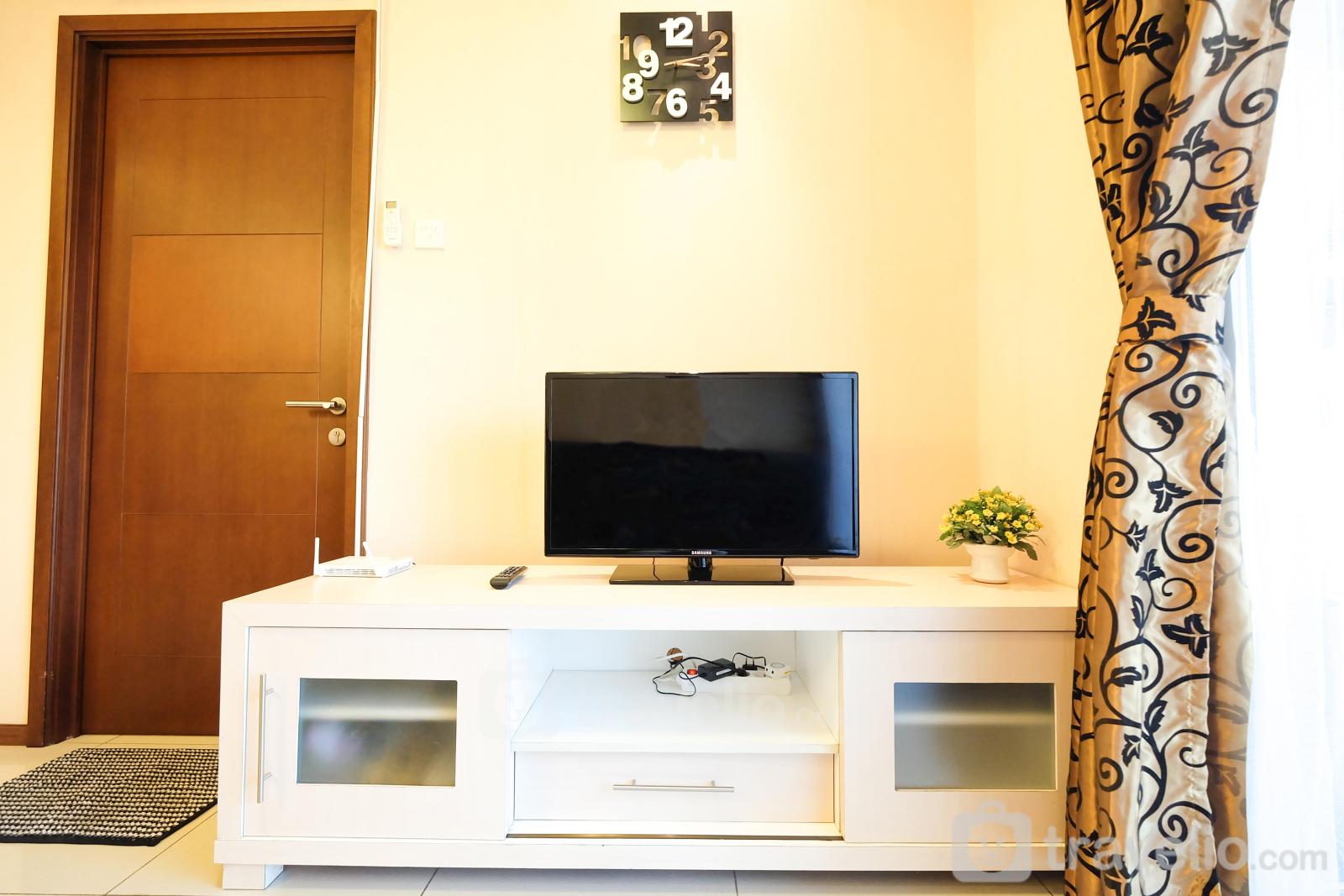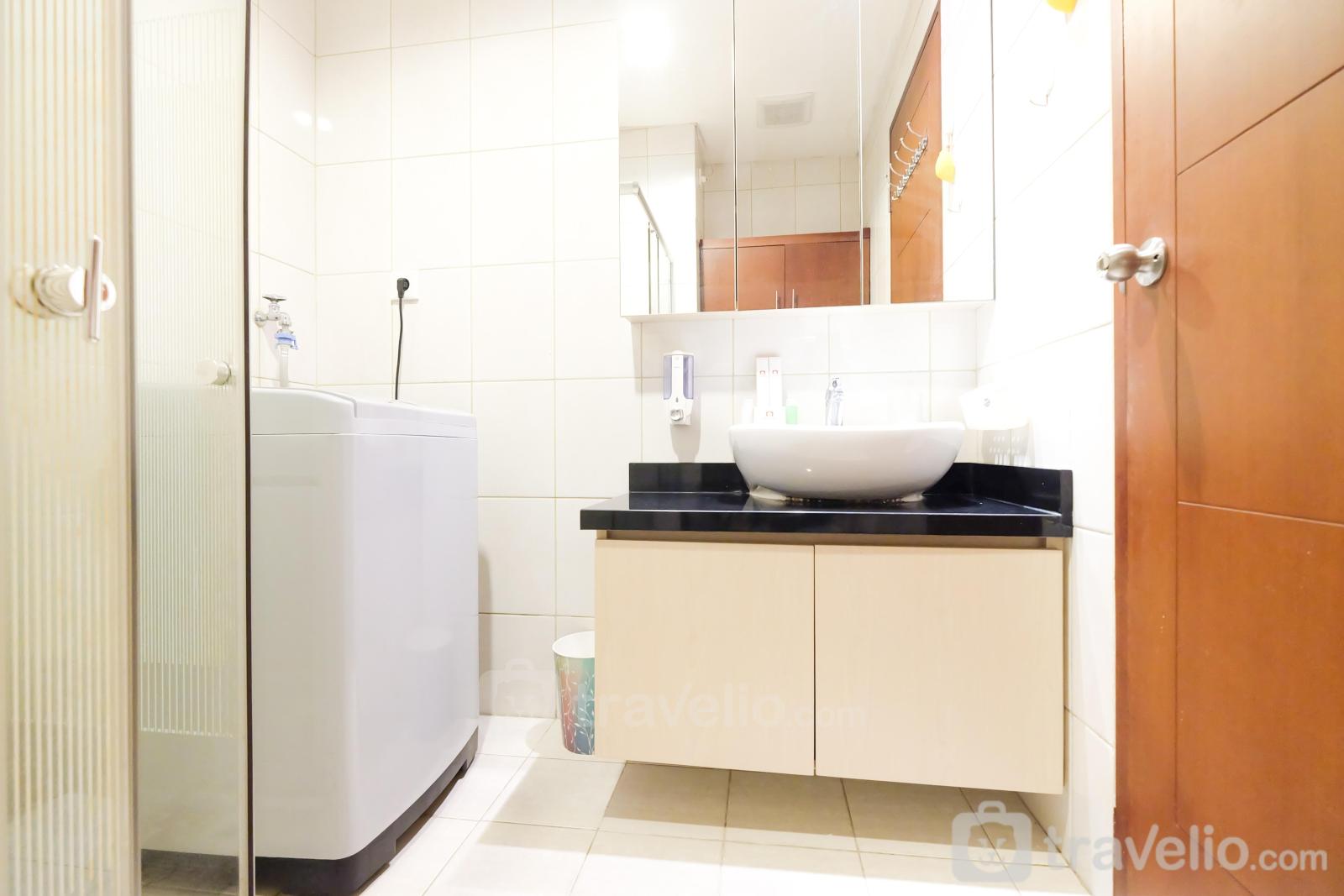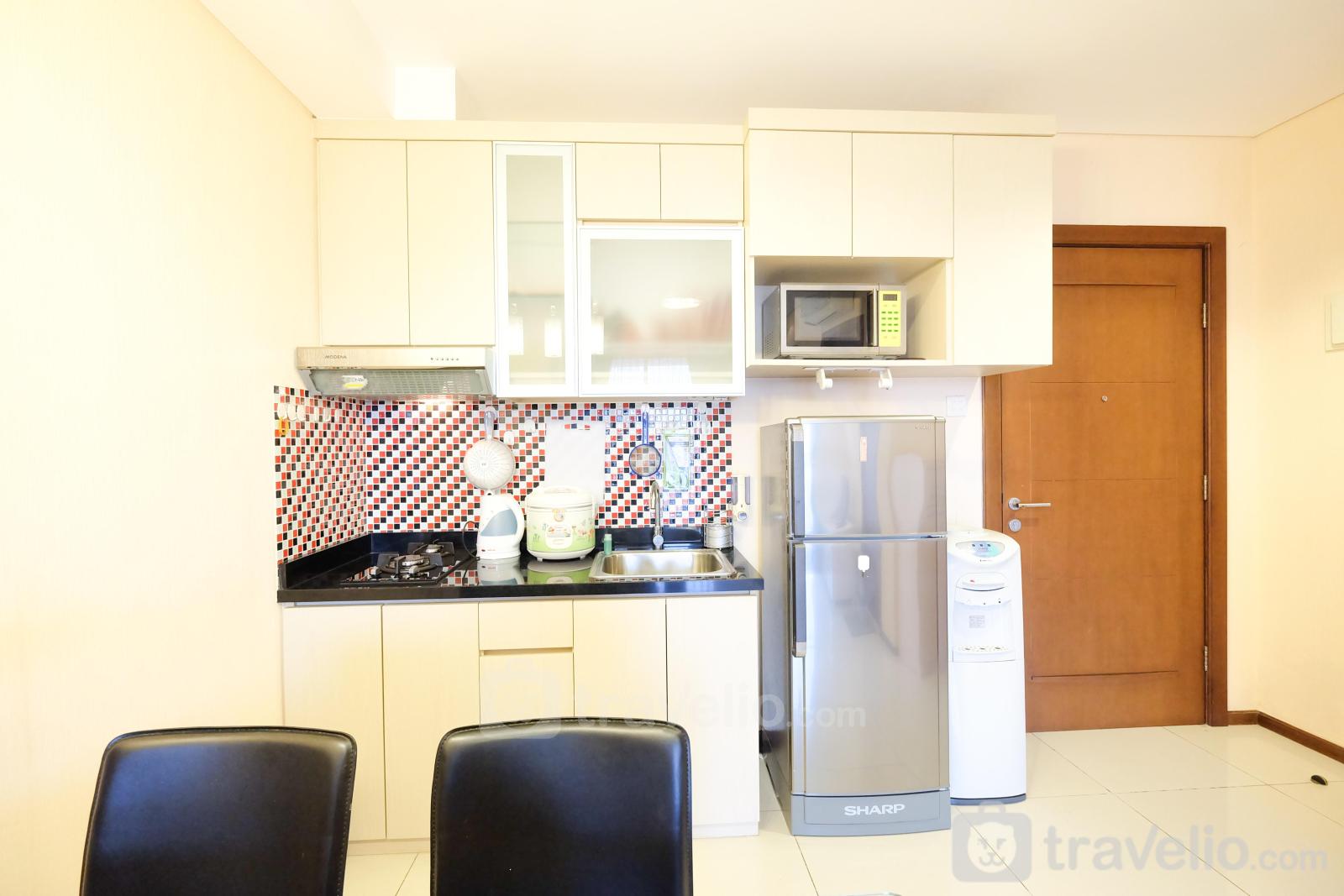 This apartment has wood-based furniture combined with cream-colored walls make this room feels comfortable. Your rest will be maximized with a queen-size bed wrapped with quality linen. There is air conditioning in this room that supports your rest. To support your activities, this apartment provides TV and free wifi access.