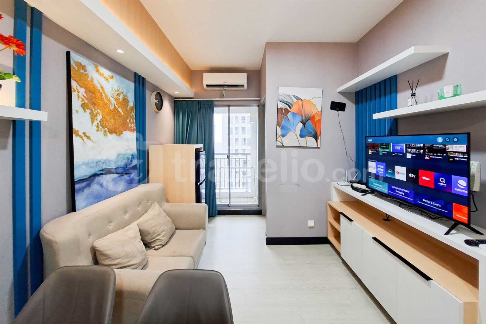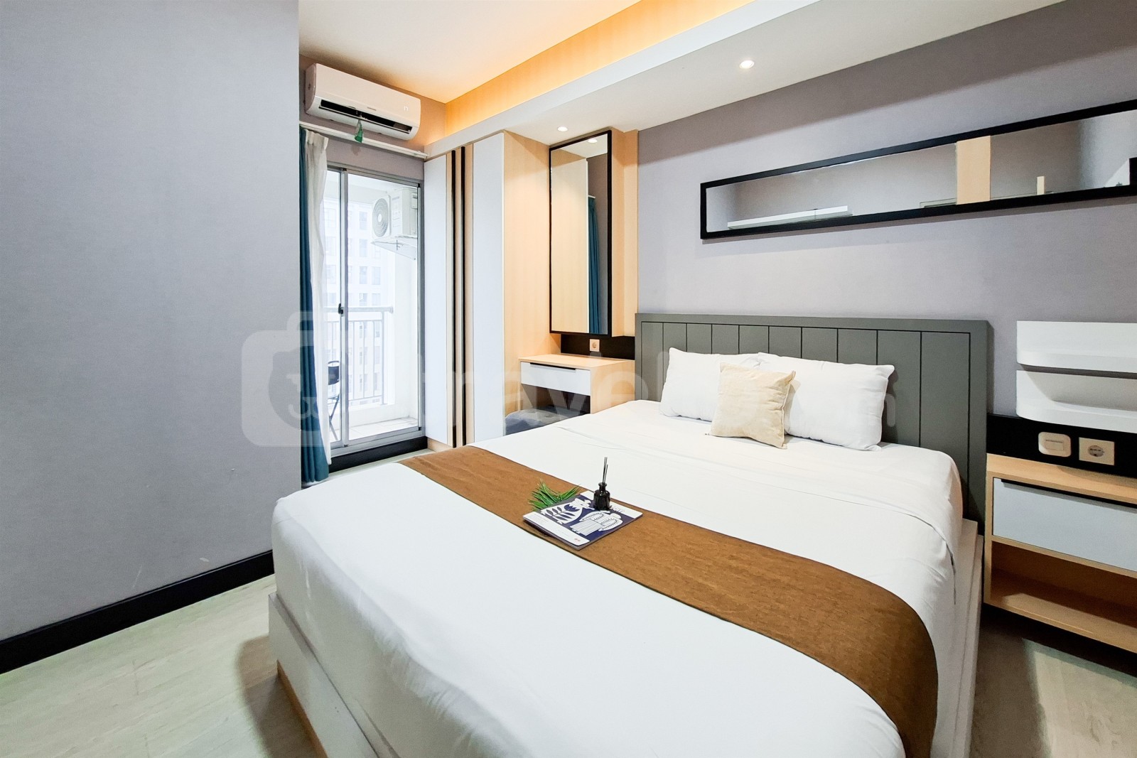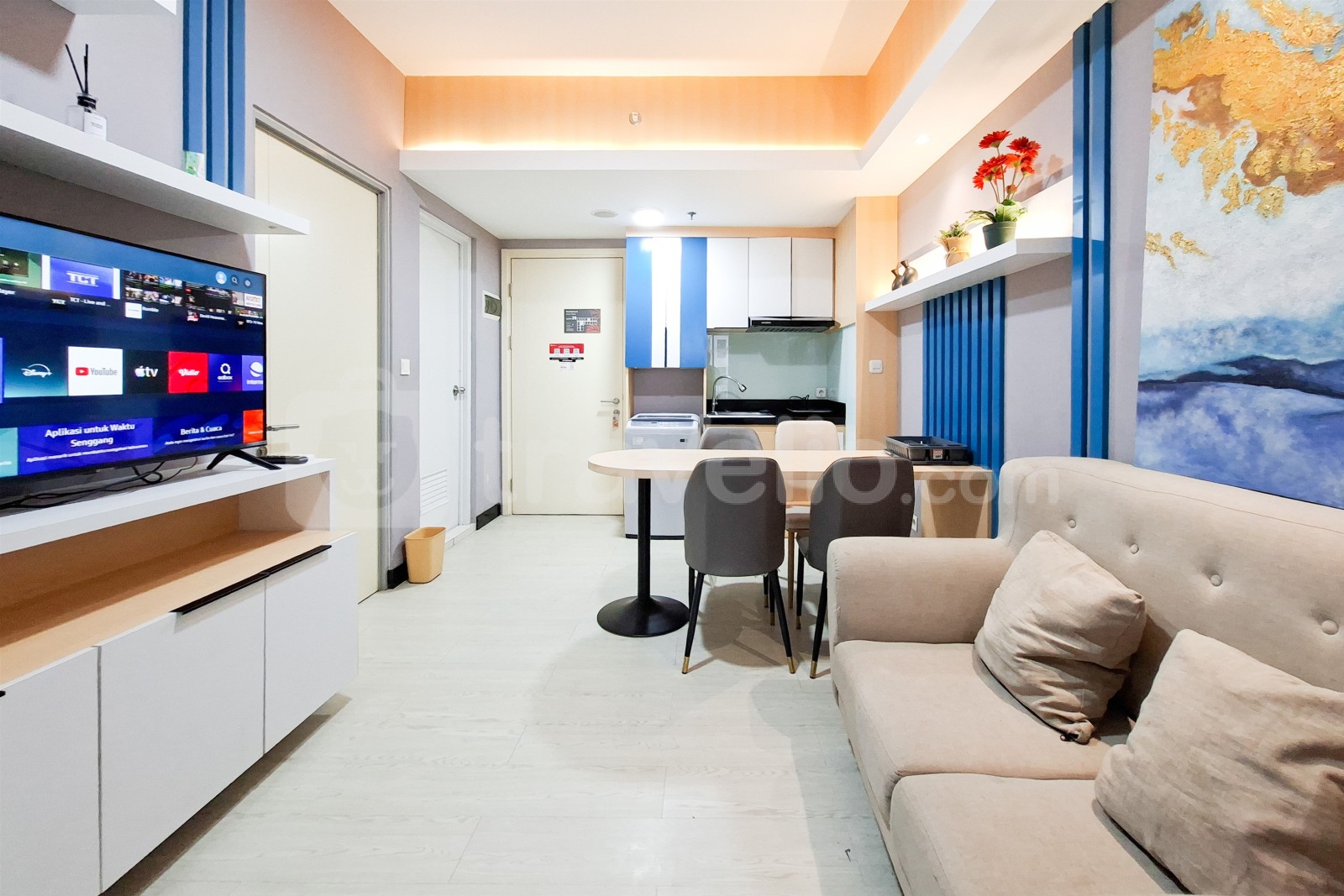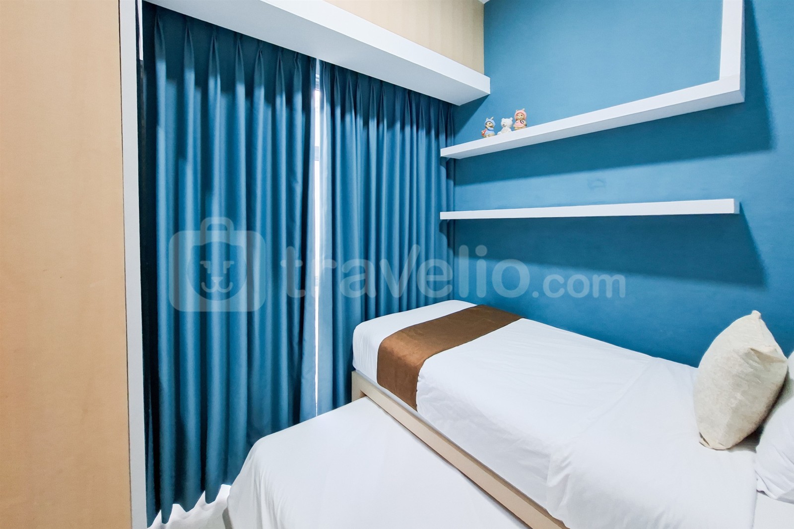 This apartment unit also provides 2 beds, Queen Bed (160x200), Trundle Bed (Single Bed & Single Underbed) covered with star-hotel quality linen, air conditioner (AC), television, free Wi-Fi access in room, toiletries, and kitchenware to support your daily needs. Scenic and Comfortable 2BR Apartment M-Town Residence By Travelio is available to rent for daily, monthly, and yearly. The bathroom is equipped with water heater. From the 28 floor, you can enjoy a stunning City View.