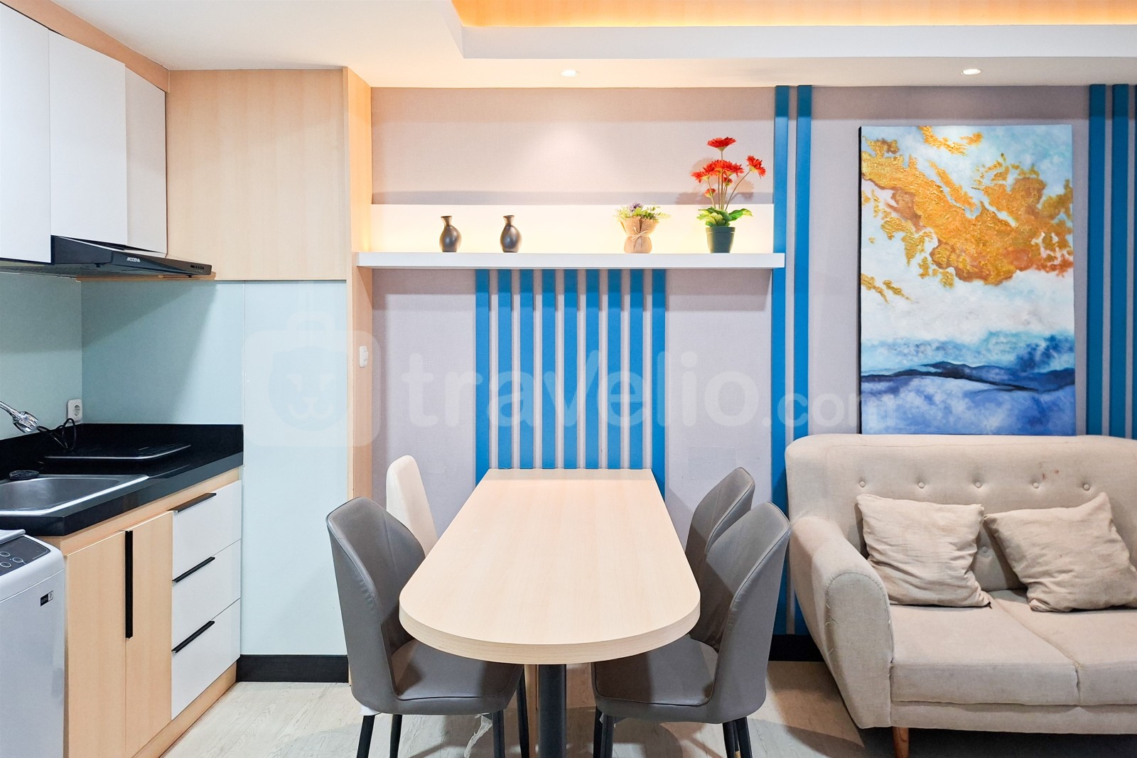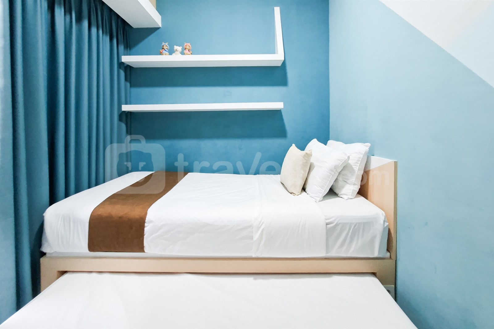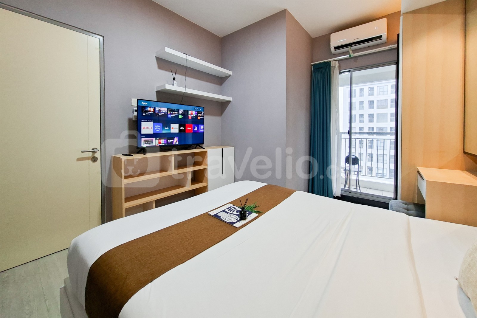 This apartment unit also provides 2 beds, Queen Bed (160x200), Trundle Bed (Single Bed & Single Underbed) covered with star-hotel quality linen, air conditioner (AC), television, free Wi-Fi access in room, toiletries, and kitchenware to support your daily needs. Scenic and Comfortable 2BR Apartment M-Town Residence By Travelio is available to rent for daily, monthly, and yearly. The bathroom is equipped with water heater. From the 28 floor, you can enjoy a stunning City View.