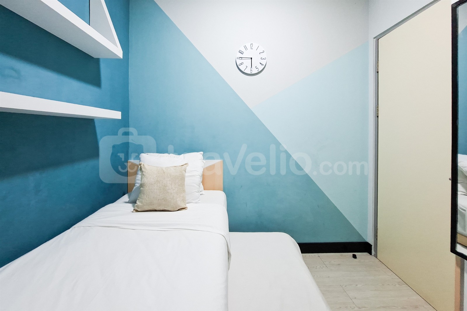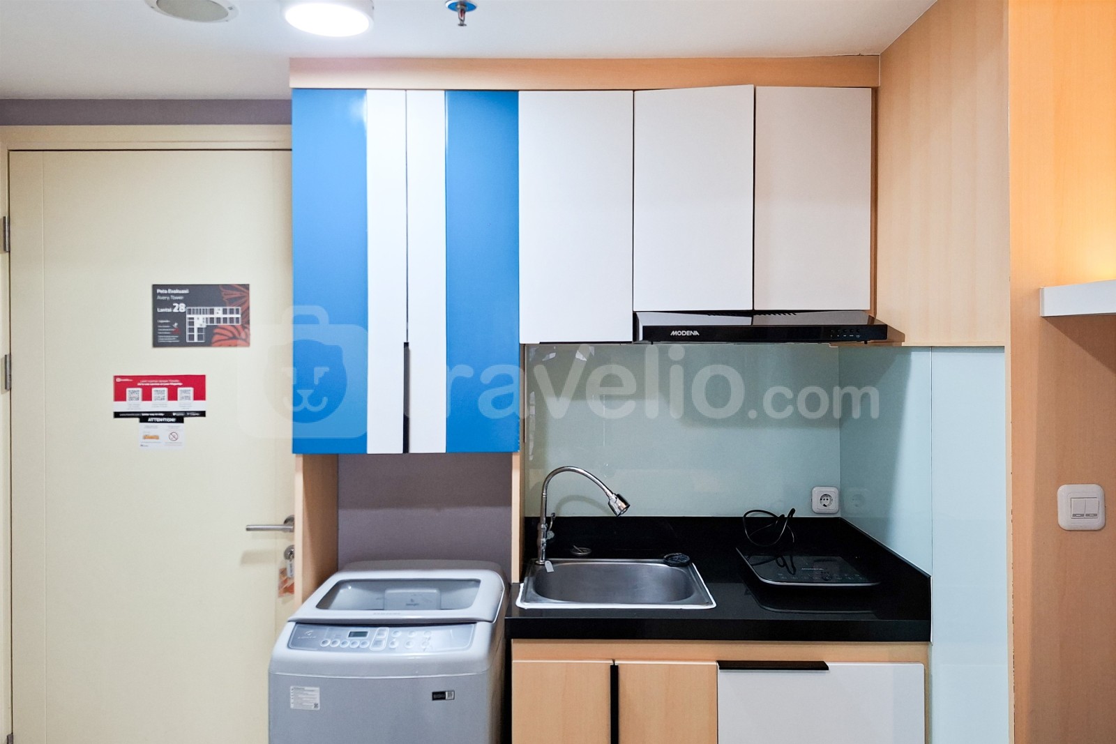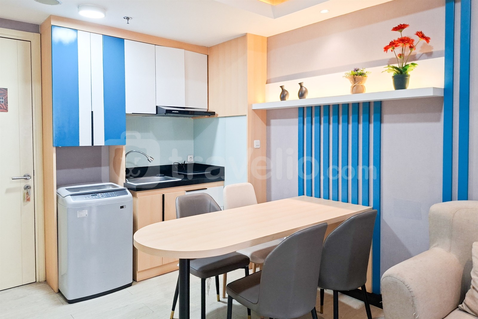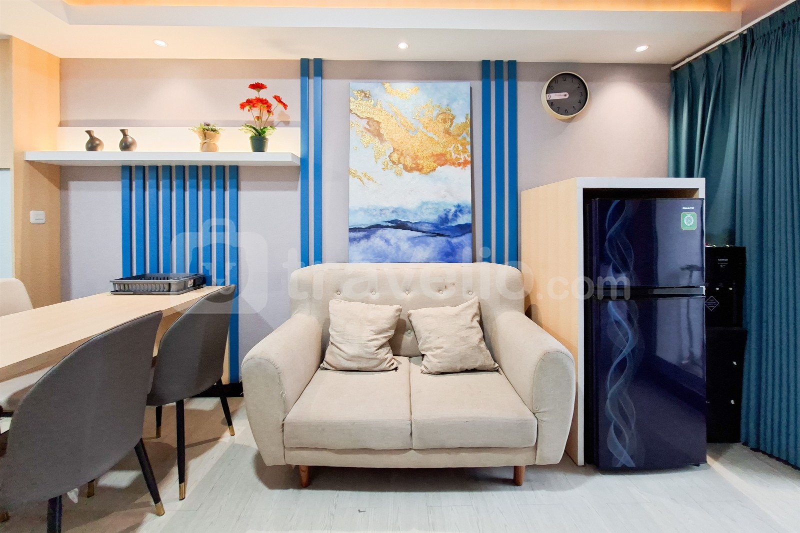 This apartment unit also provides 2 beds, Queen Bed (160x200), Trundle Bed (Single Bed & Single Underbed) covered with star-hotel quality linen, air conditioner (AC), television, free Wi-Fi access in room, toiletries, and kitchenware to support your daily needs. Scenic and Comfortable 2BR Apartment M-Town Residence By Travelio is available to rent for daily, monthly, and yearly. The bathroom is equipped with water heater. From the 28 floor, you can enjoy a stunning City View.