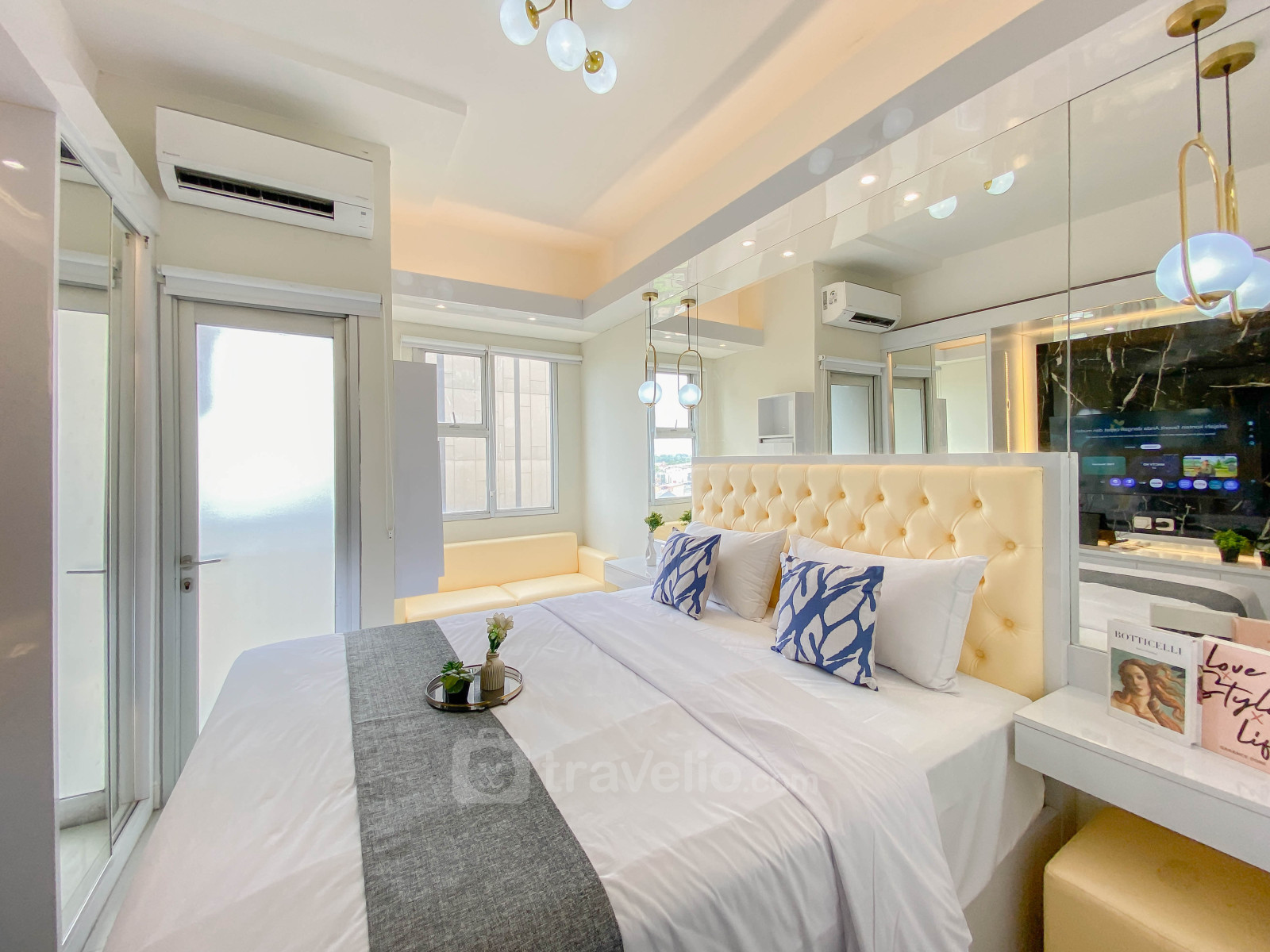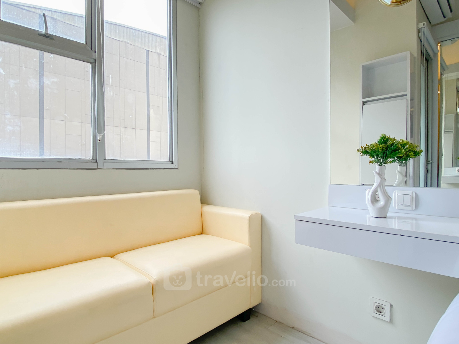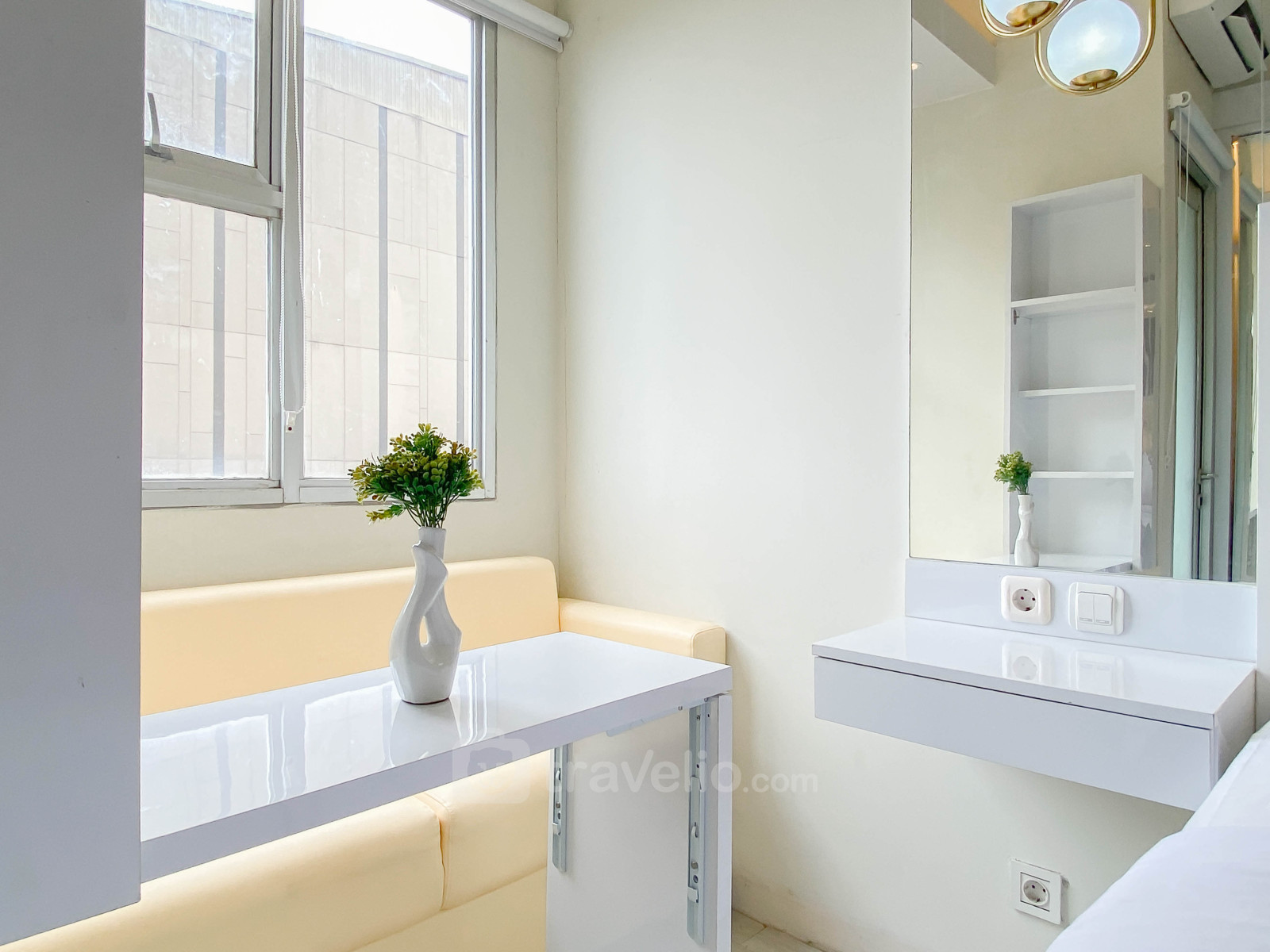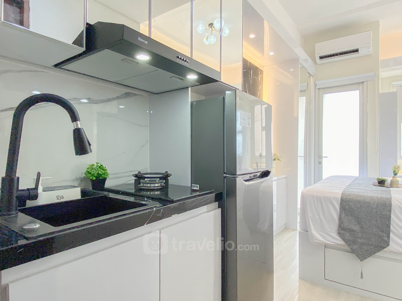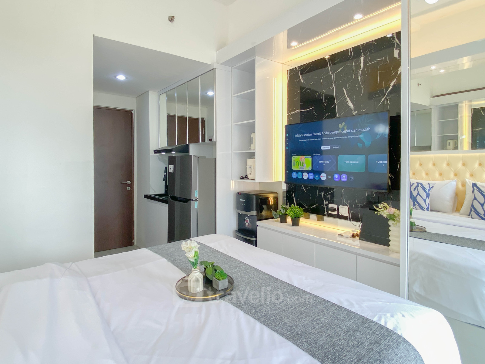 Nikmati hunian studio seluas 23,99 m² dengan desain putih yang bersih dan nyaman. Unit ini dilengkapi kasur queen bed sehingga dapat menampung hingga 2 orang, cocok untuk pasangan, perjalanan bisnis, maupun hunian jangka pendek di kawasan Bekasi Timur.