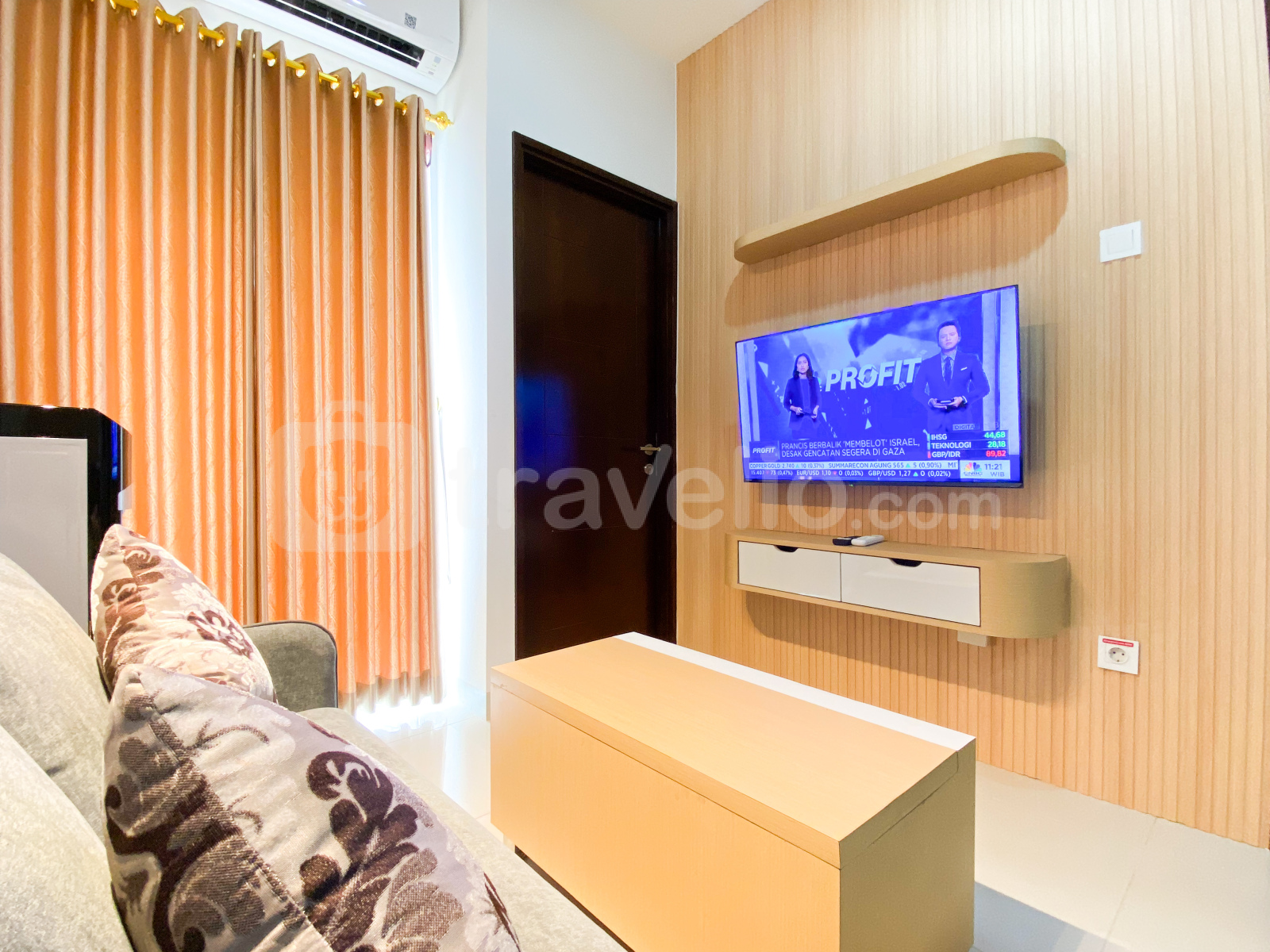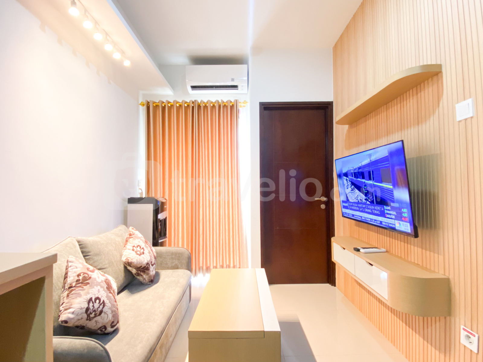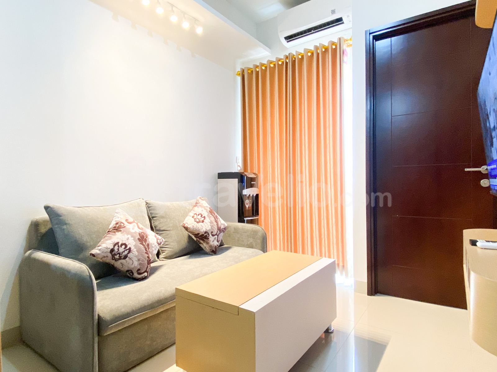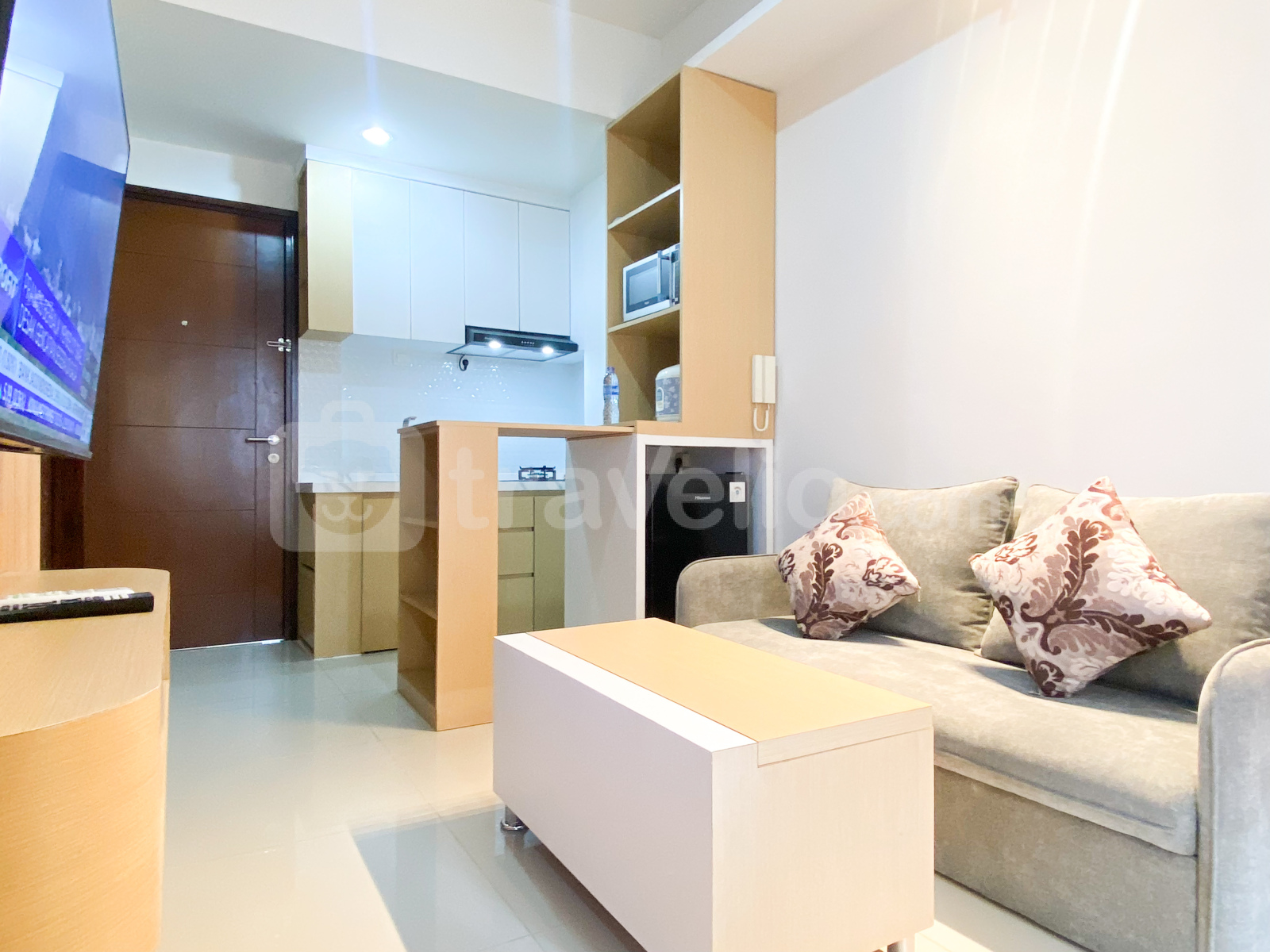 Selamat datang di Good and Homey 2BR at Thamrin District Bekasi Apartment By Travelio, menawarkan ruang tamu yang menyenangkan di kawasan Marga Jaya, Bekasi yang semarak.