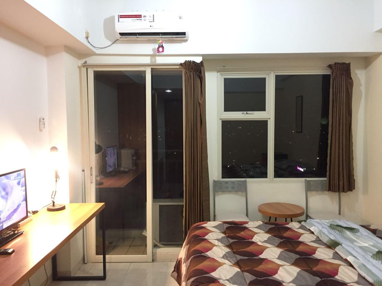 Apartemen dengan fasilitas lengkap mencakup AC, TV, dispenser, parkir luas, CCTV, dan balkon dengan pemandangan indah Kota Depok. Kamar mandi tersedia lengkap dengan shower.