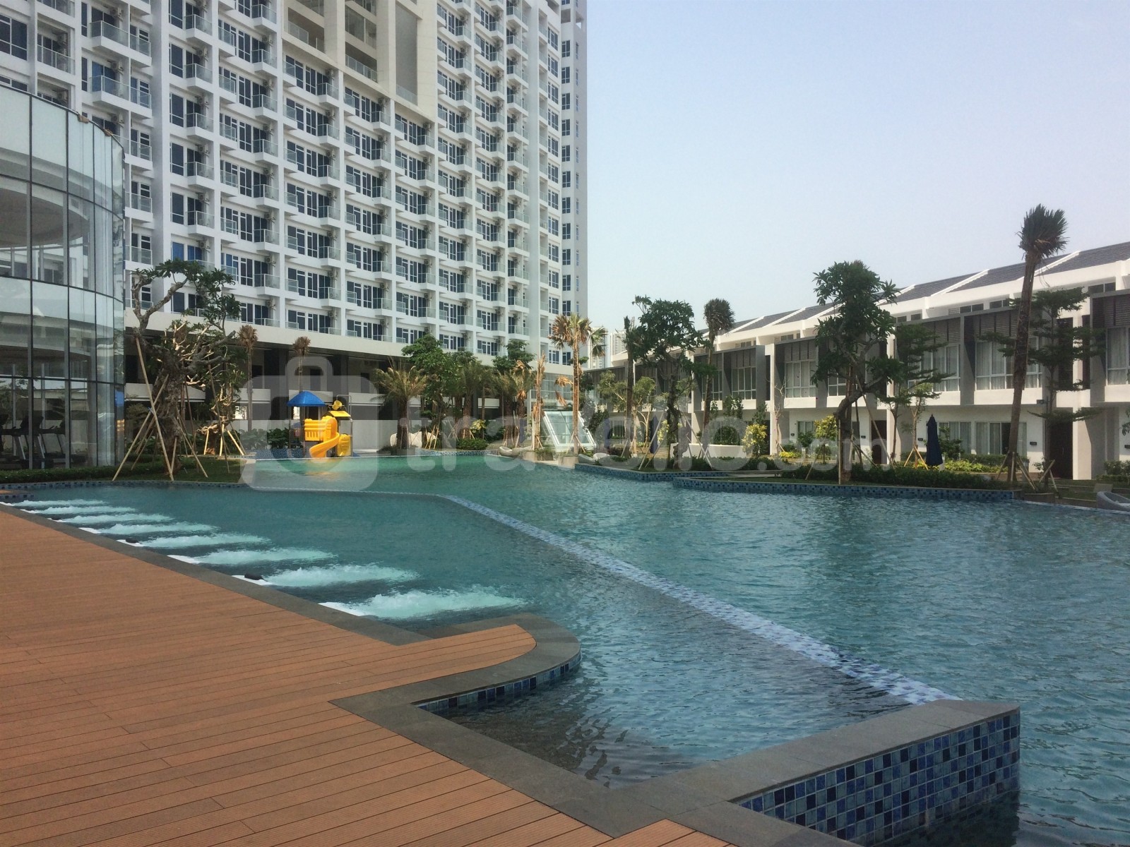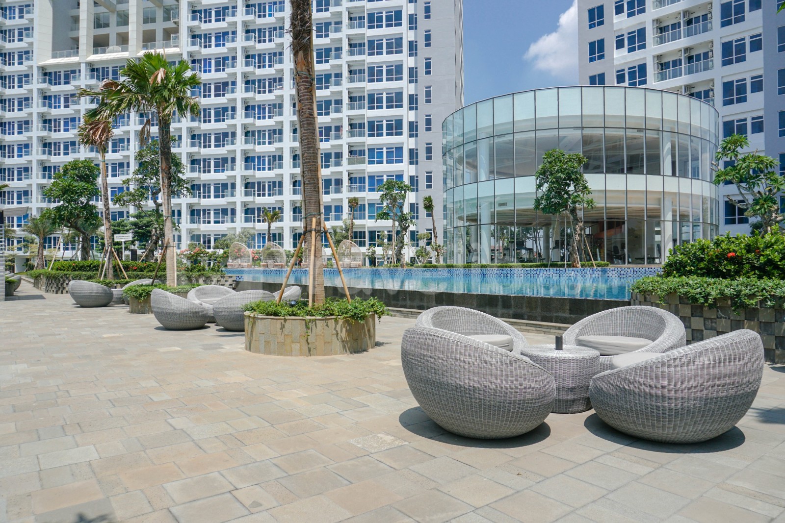 Gedung apartemen juga menyediakan fasilitas lengkap seperti keamanan 24 jam, access card, lapangan basket, kafe, lift, jogging track, lounge, minimarket, area bermain anak, kolam renang, dan lapangan tenis.
