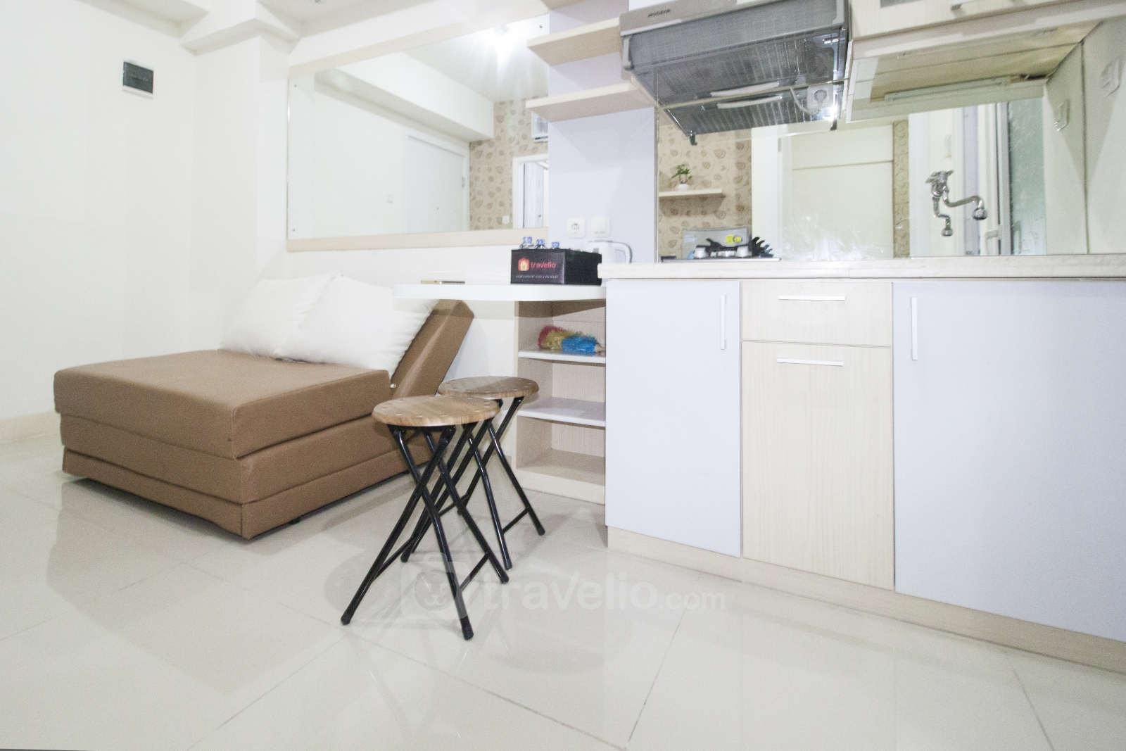 Unit apartemen ini menghiasi ruangan Anda dengan sentuhan warna putih dan abu abu untuk menciptakan sensasi minimalis. Pada ruang tengah terdapat cermin besar sehingga memantulkan ruangan untuk menambah kesan luas pada unit Anda.
