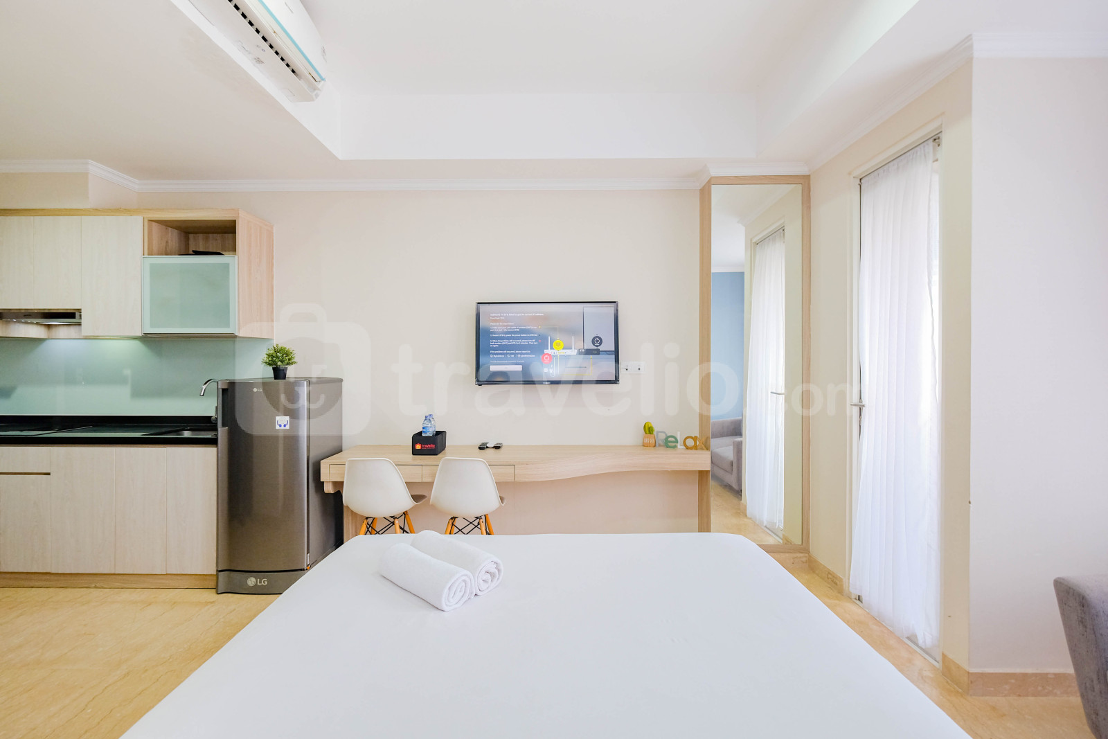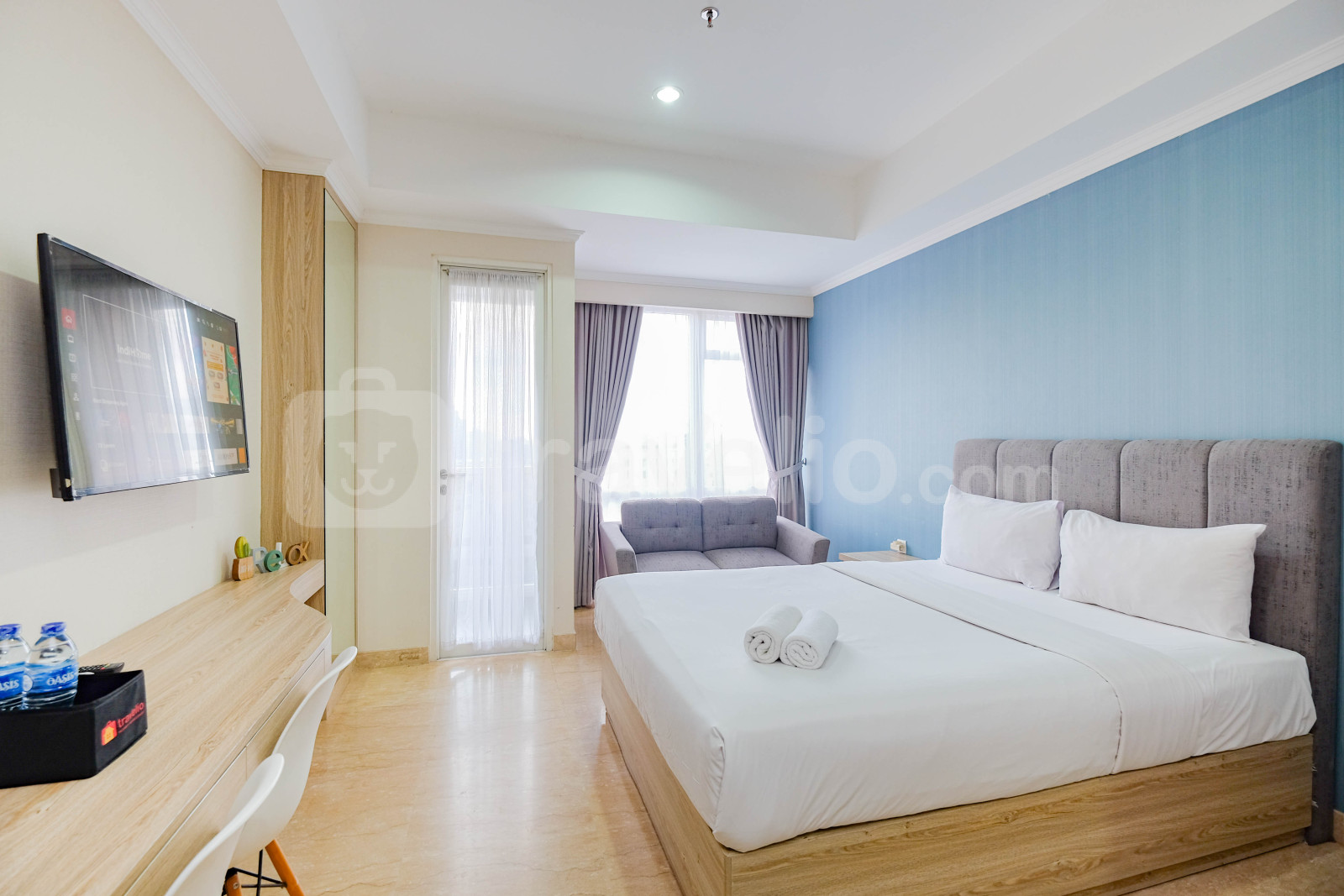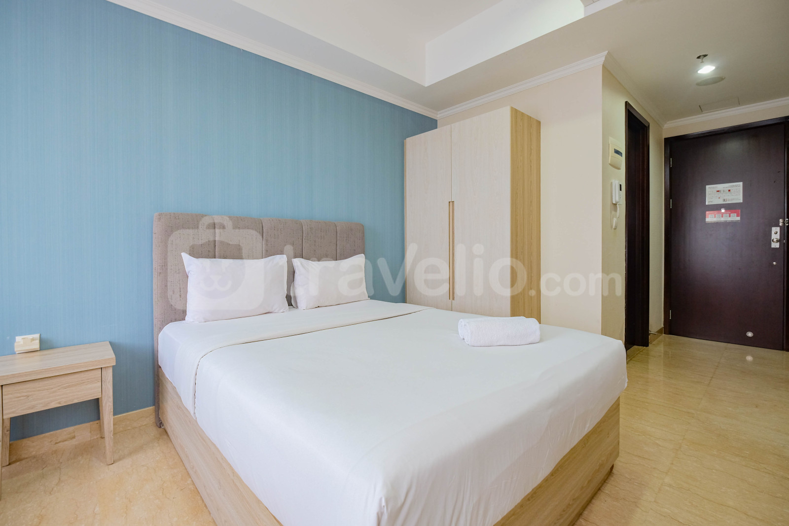 Unit apartemen ini juga menyediakan 1 kasur ukuran Queen (160x200) berbalut linen kualitas hotel berbintang, pendingin ruangan, televisi, akses Wi-Fi gratis, perlengkapan mandi, peralatan makan dan memasak untuk menunjang kebutuhan harian Anda.