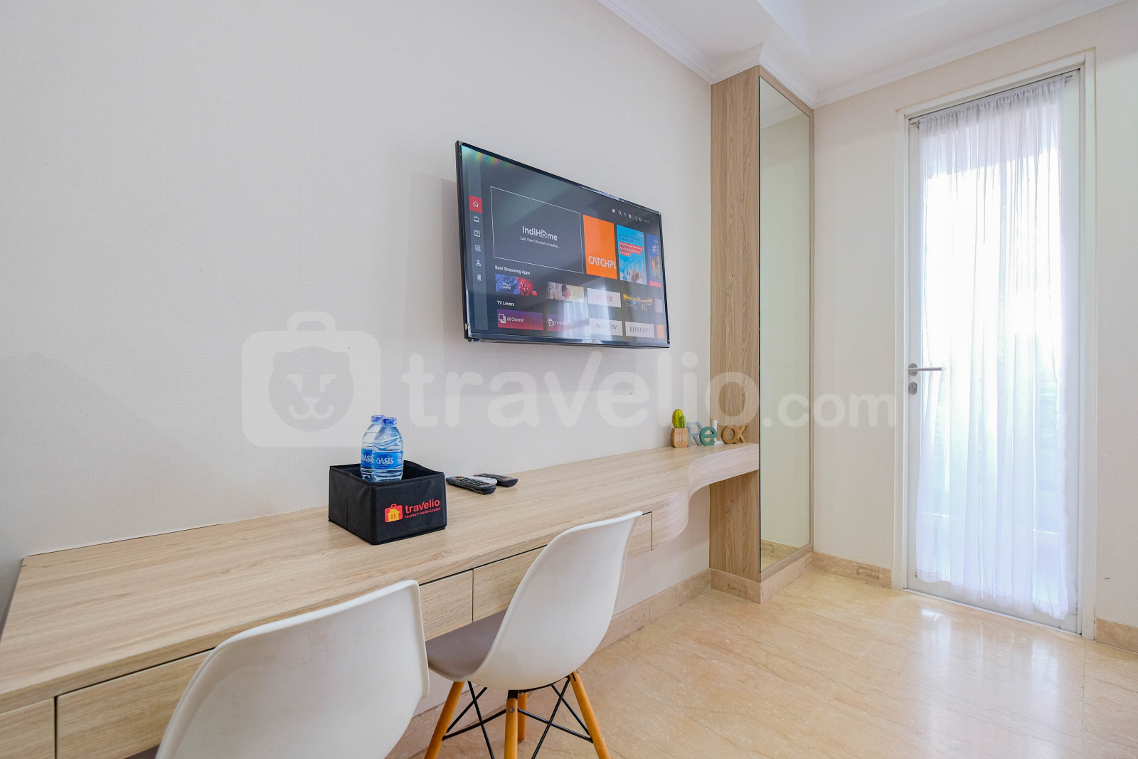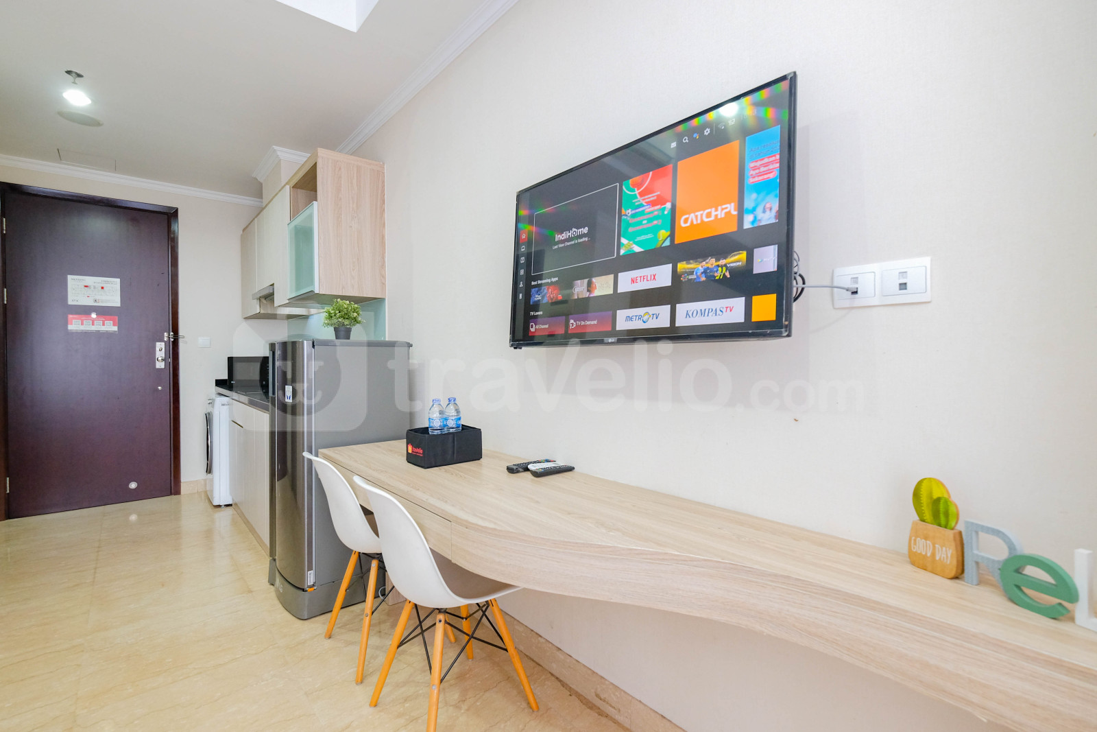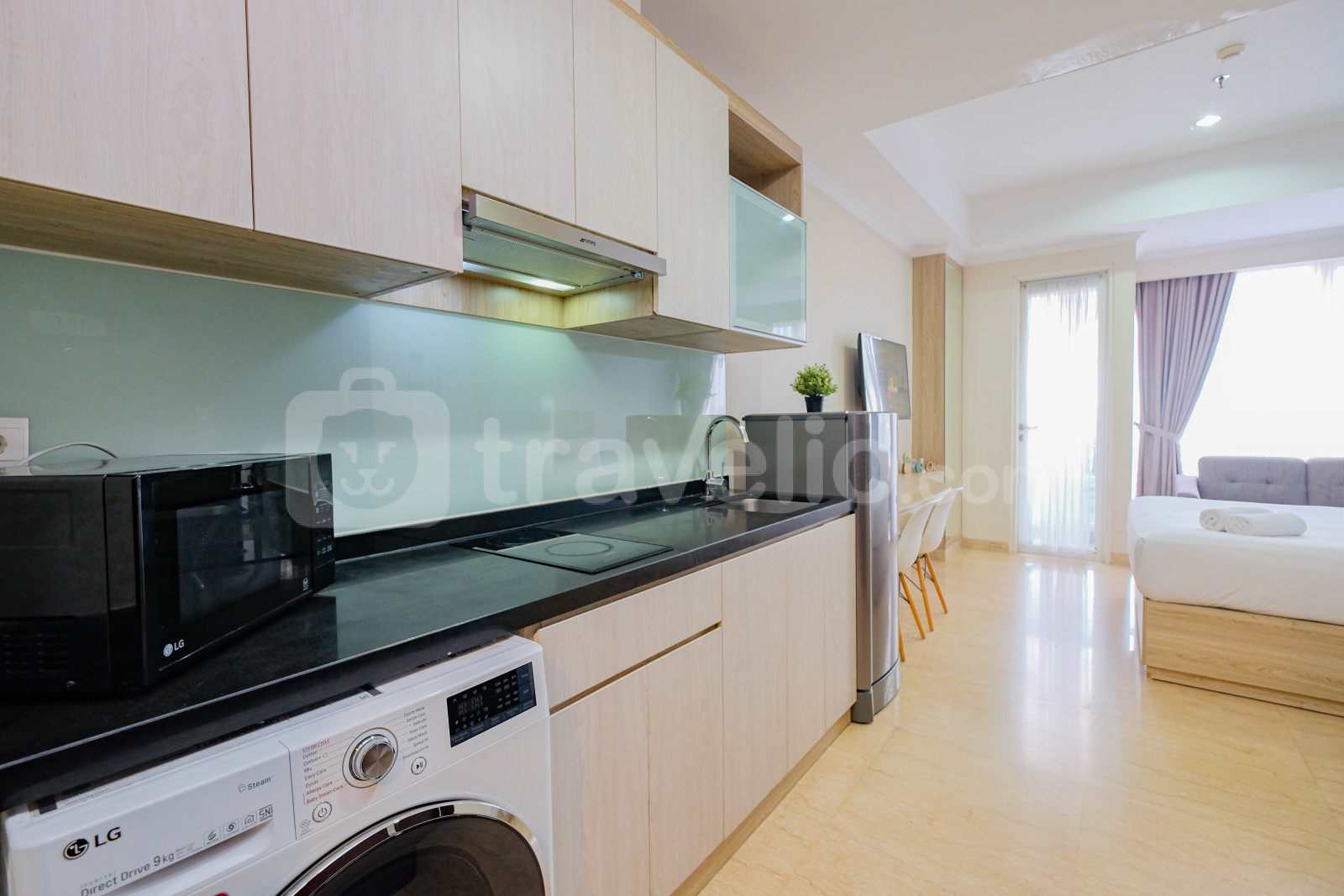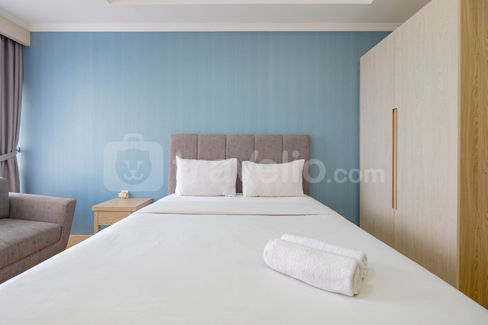 Unit apartemen ini juga menyediakan 1 kasur ukuran Queen (160x200) berbalut linen kualitas hotel berbintang, pendingin ruangan, televisi, akses Wi-Fi gratis, perlengkapan mandi, peralatan makan dan memasak untuk menunjang kebutuhan harian Anda.