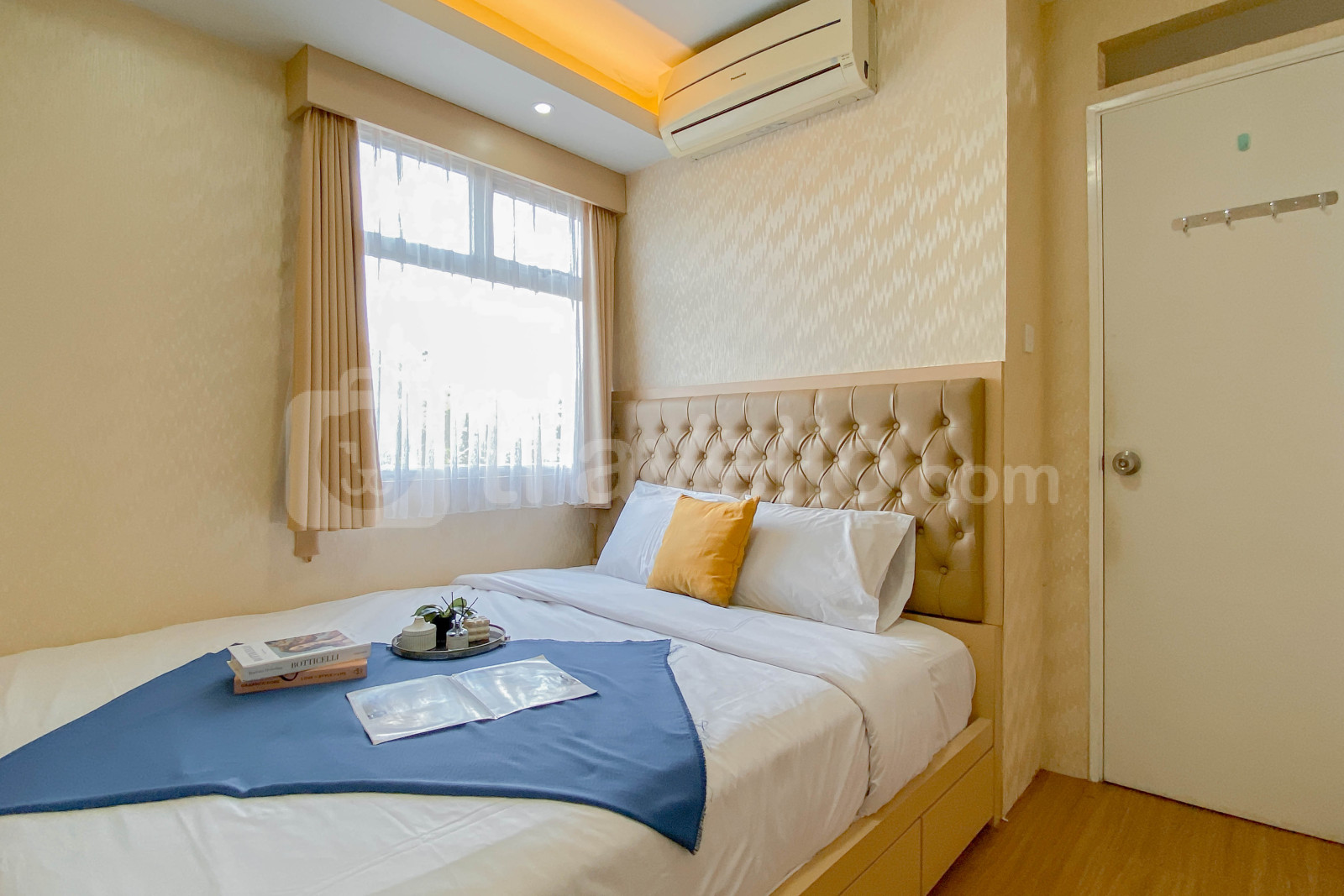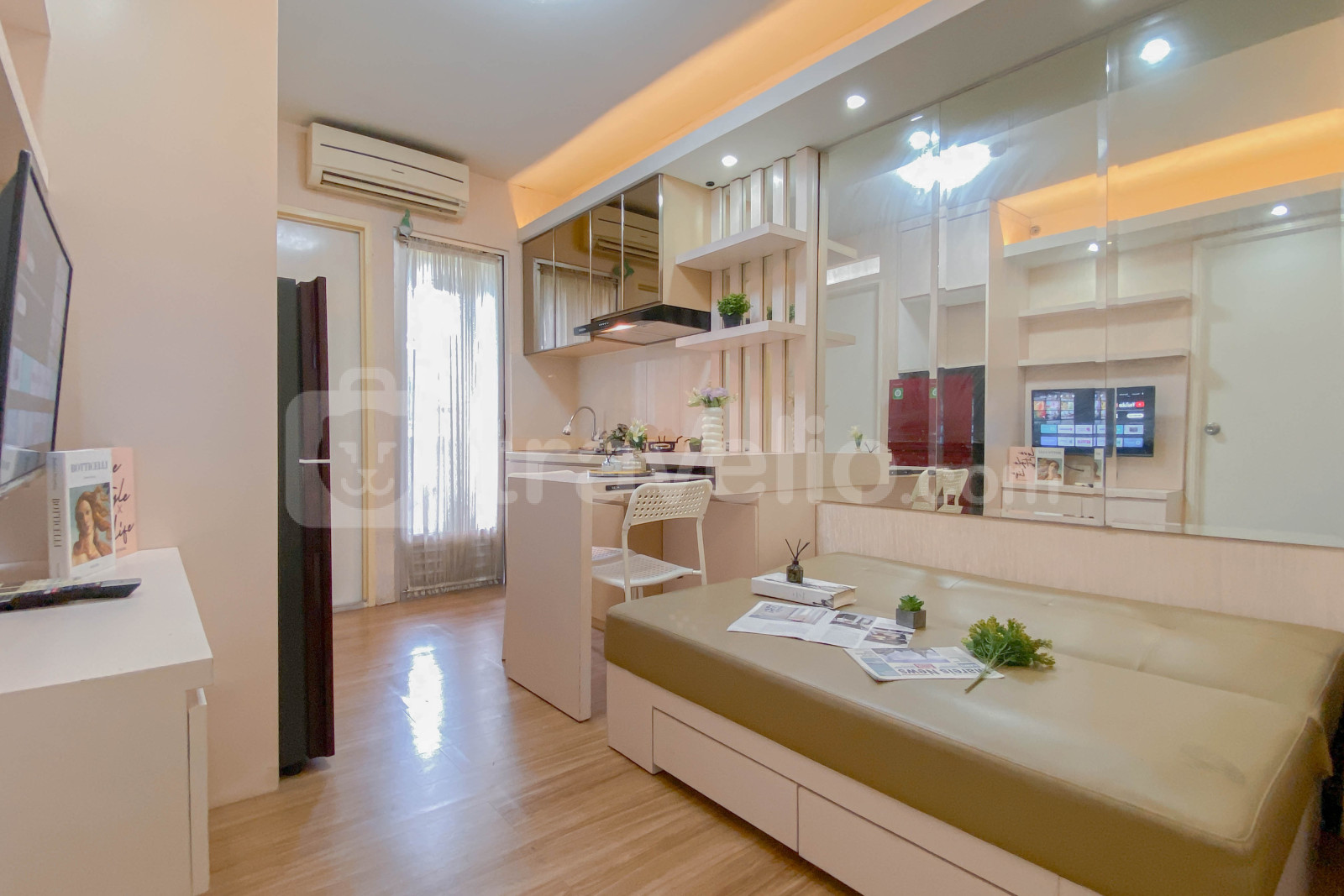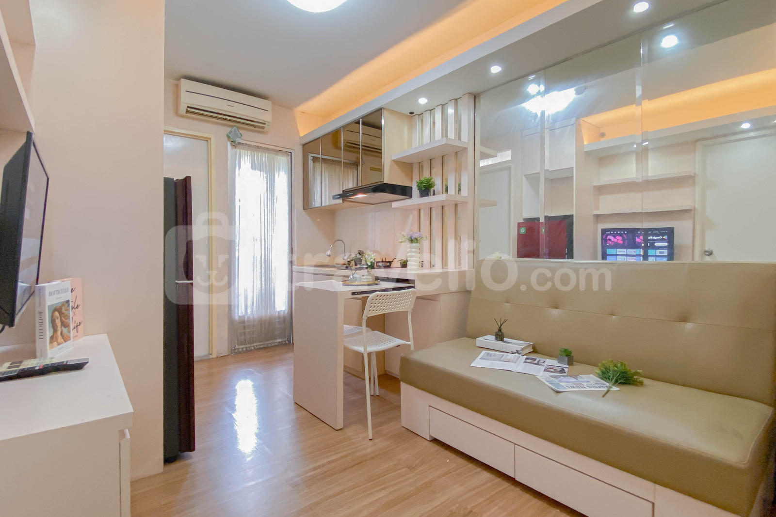Unit ini dilengkapi dengan fasilitas penting seperti TV, kulkas, dan water heater, untuk menunjang kenyamanan Anda selama menginap. Desain interior bergaya minimalis menciptakan suasana yang lapang dan tenang, sempurna untuk bersantai setelah beraktivitas seharian.