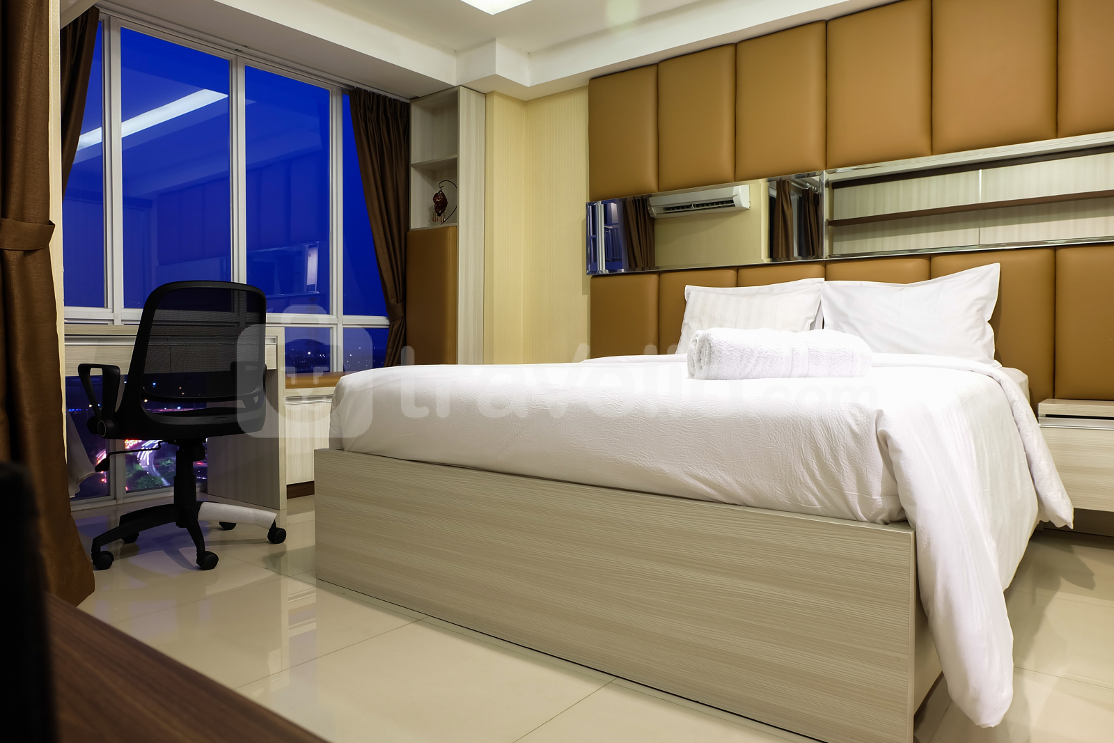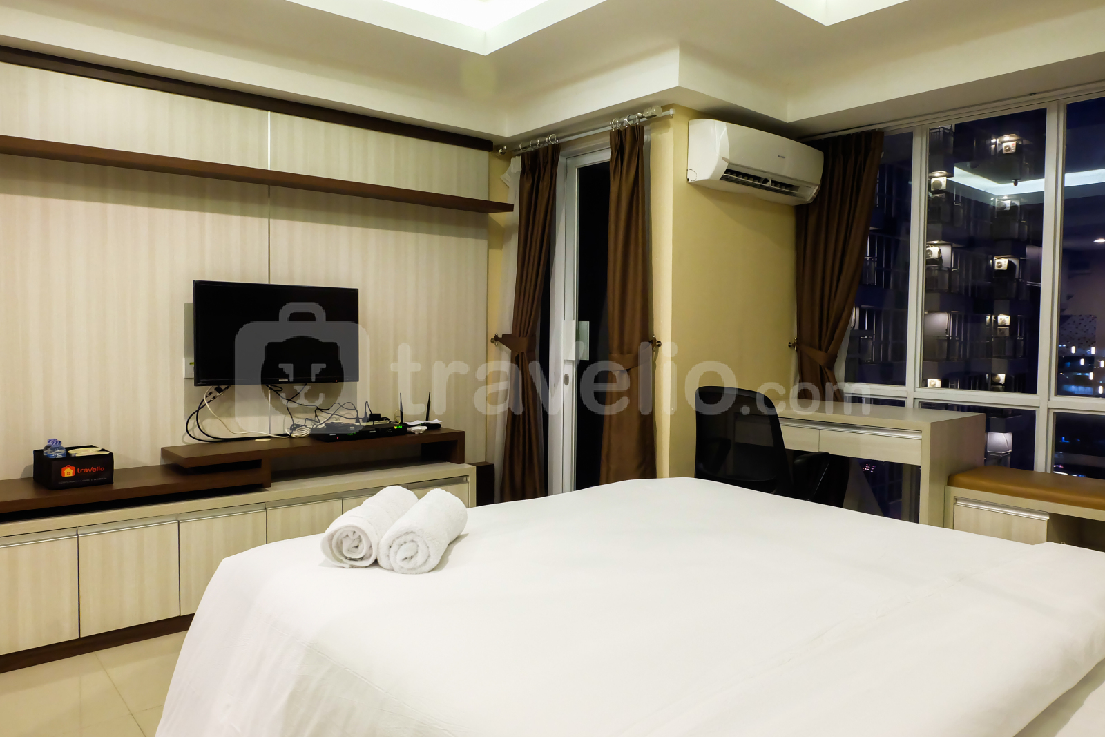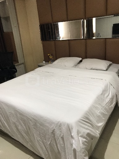 Terdapat tempat tidur ukuran queen size dilengkapi dengan meja kerja, dan lemari. AC, TV dan akses internet juga tersedia di dalam apartemen ini.