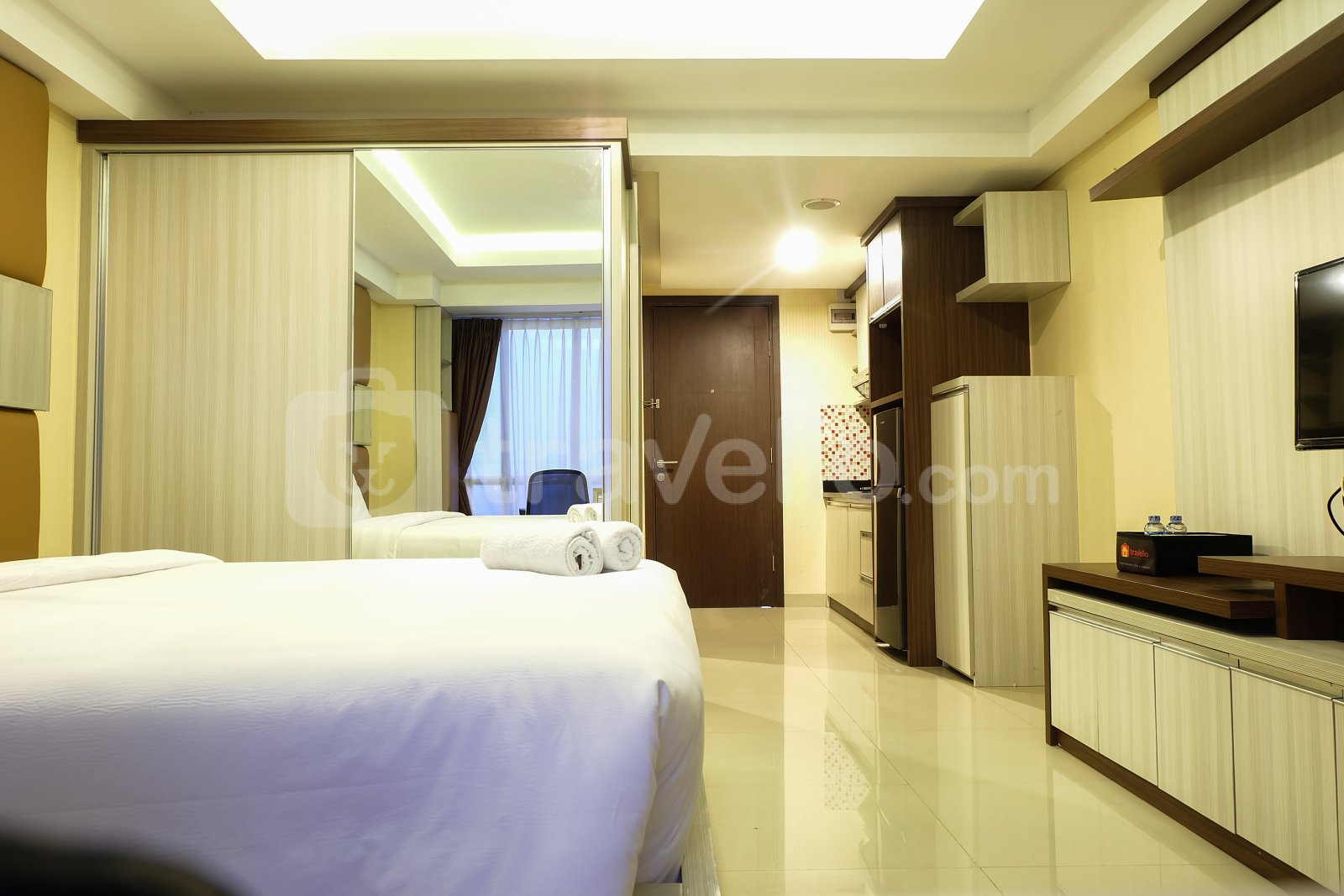 Apartemen studio seluas 37 meter persegi ini difasilitasi dengan tempat tidur ukuran queen. Tak jauh dari tempat tidur, terdapat meja dan kursi yang bisa Anda gunakan untuk bekerja. Didukung dengan fasilitas free wifi semakin memudahkan pekerjaan dan ativitas Anda ketika berselancar di dunia maya.