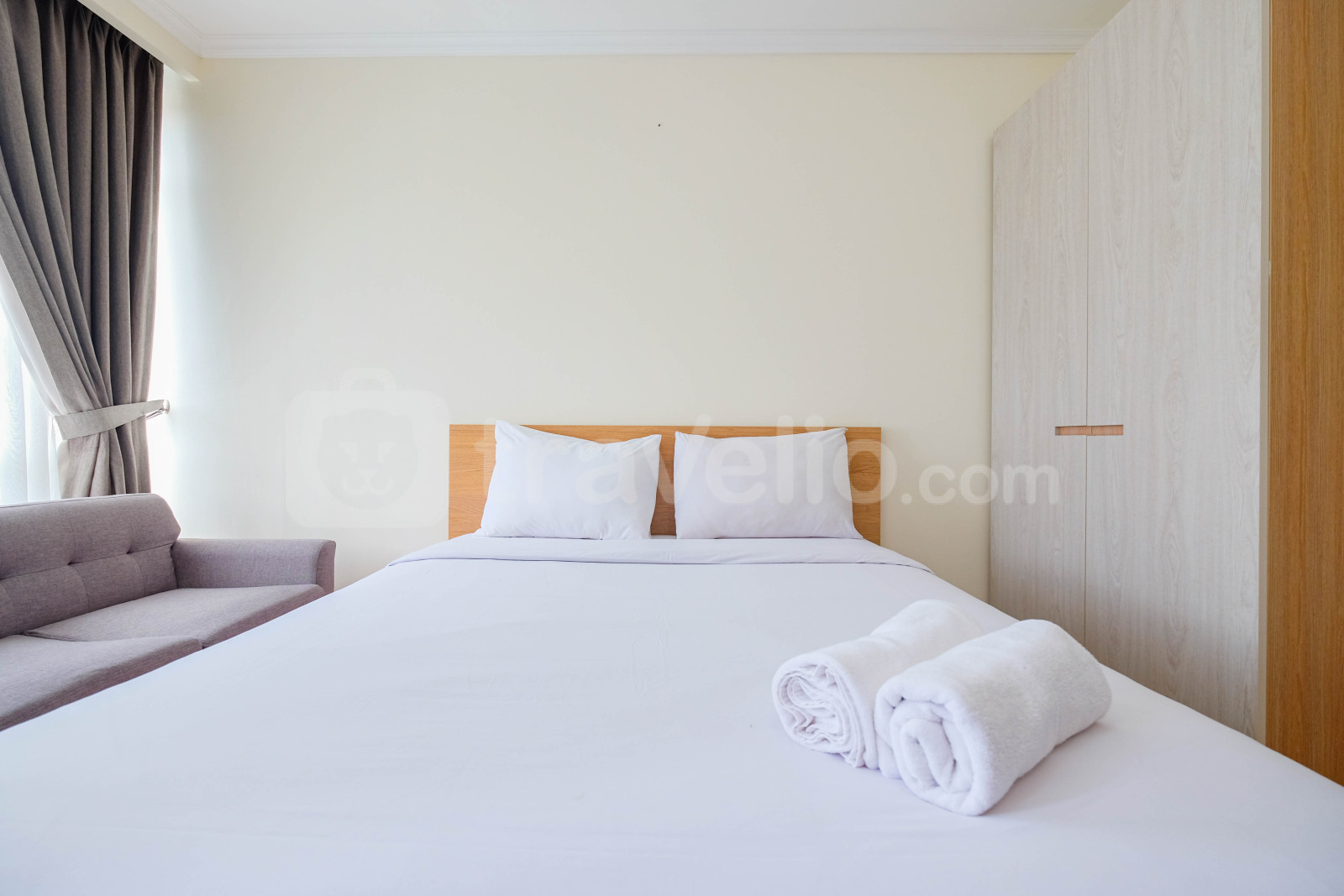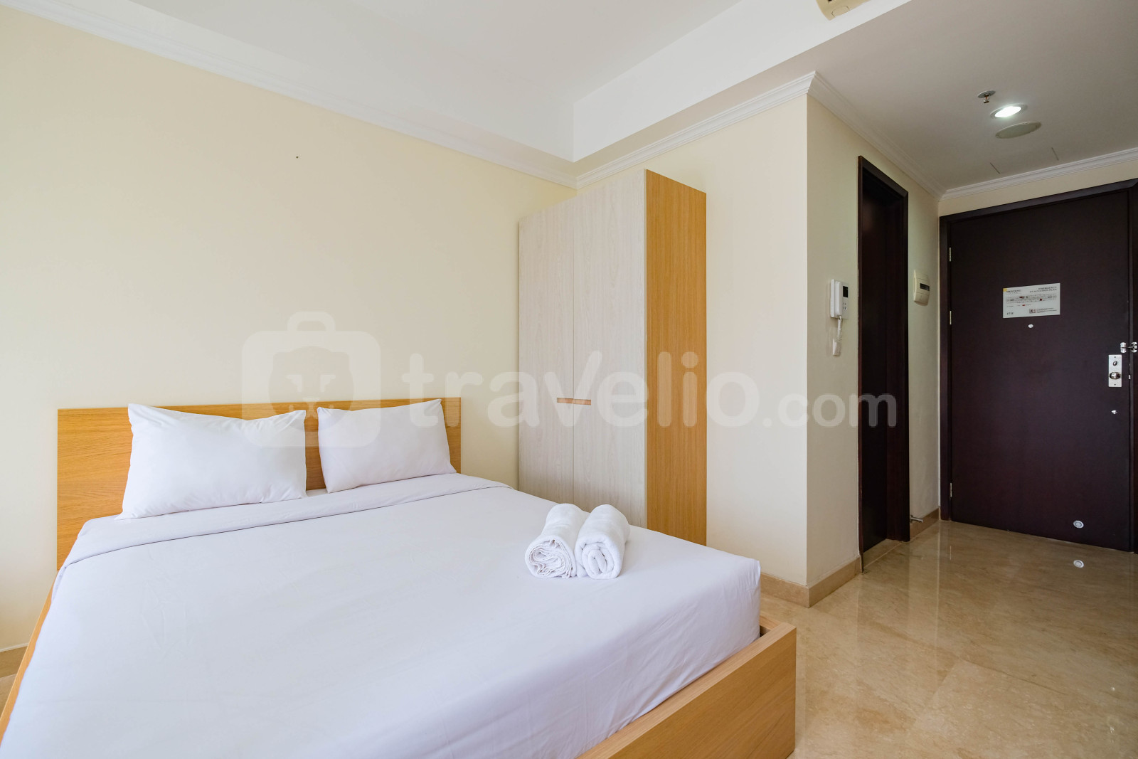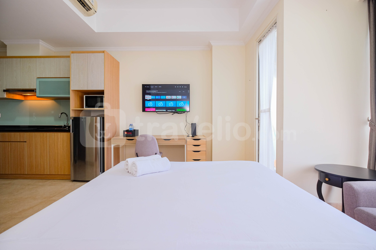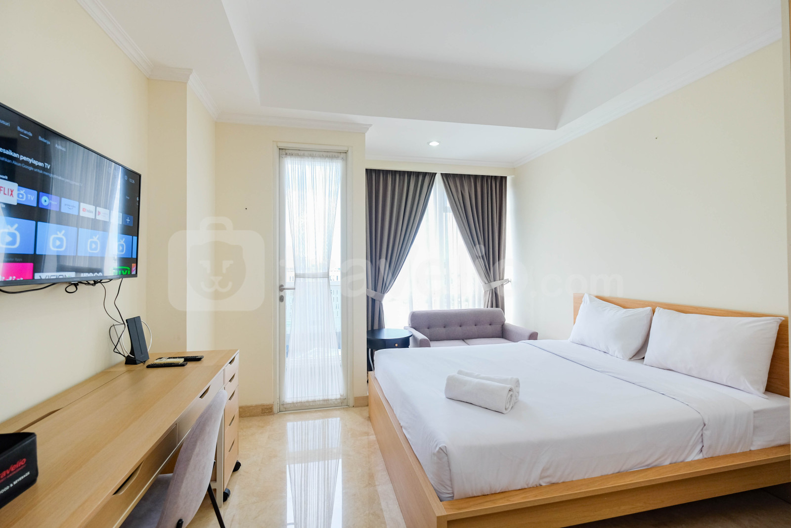 Perkenalkan, Modern Look Studio Room Menteng Park Apartment By Travelio. Studio ini menampilkan kamar tidur yang nyaman, kamar mandi yang lengkap dengan peralatan modern, dan luas 28 meter persegi.