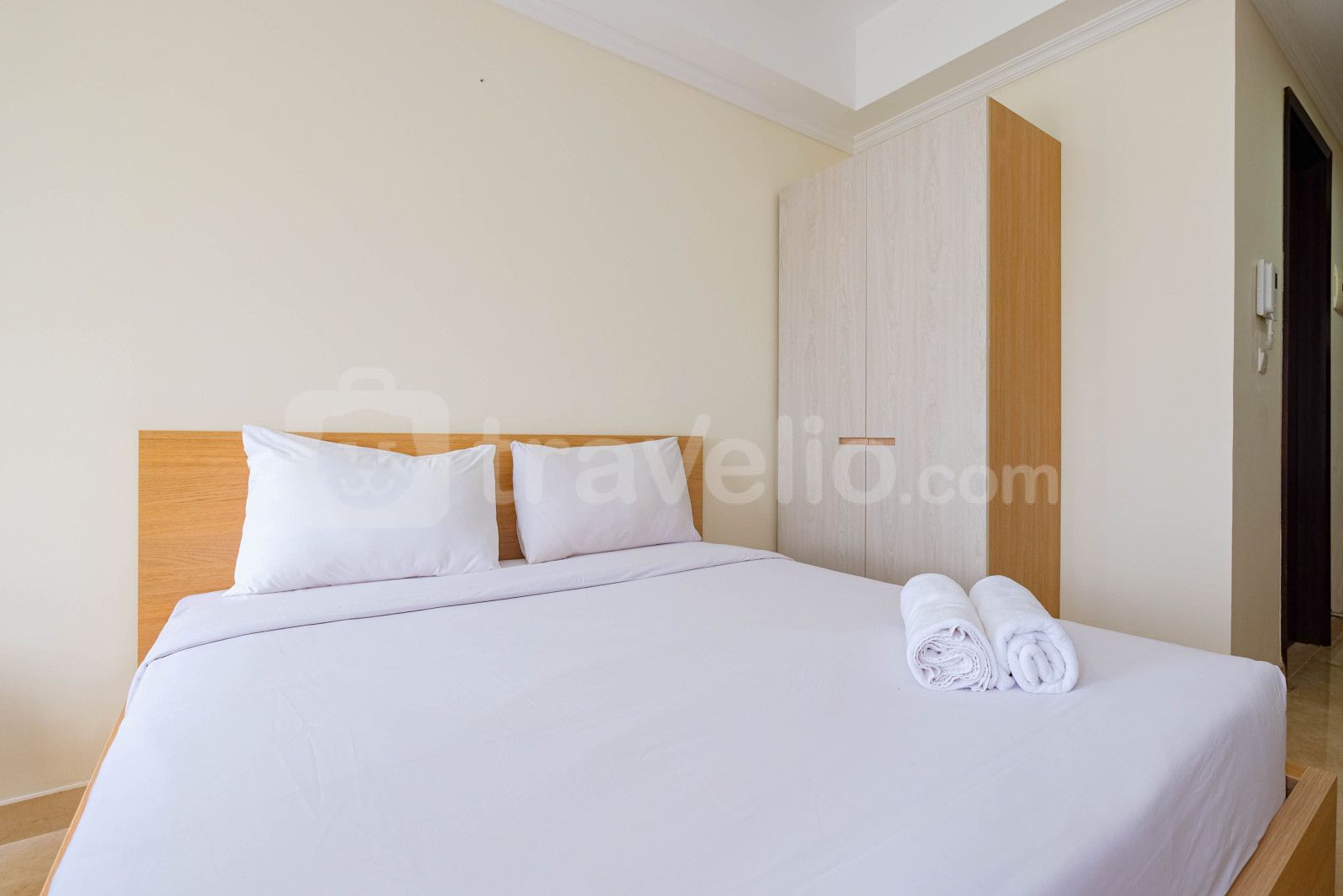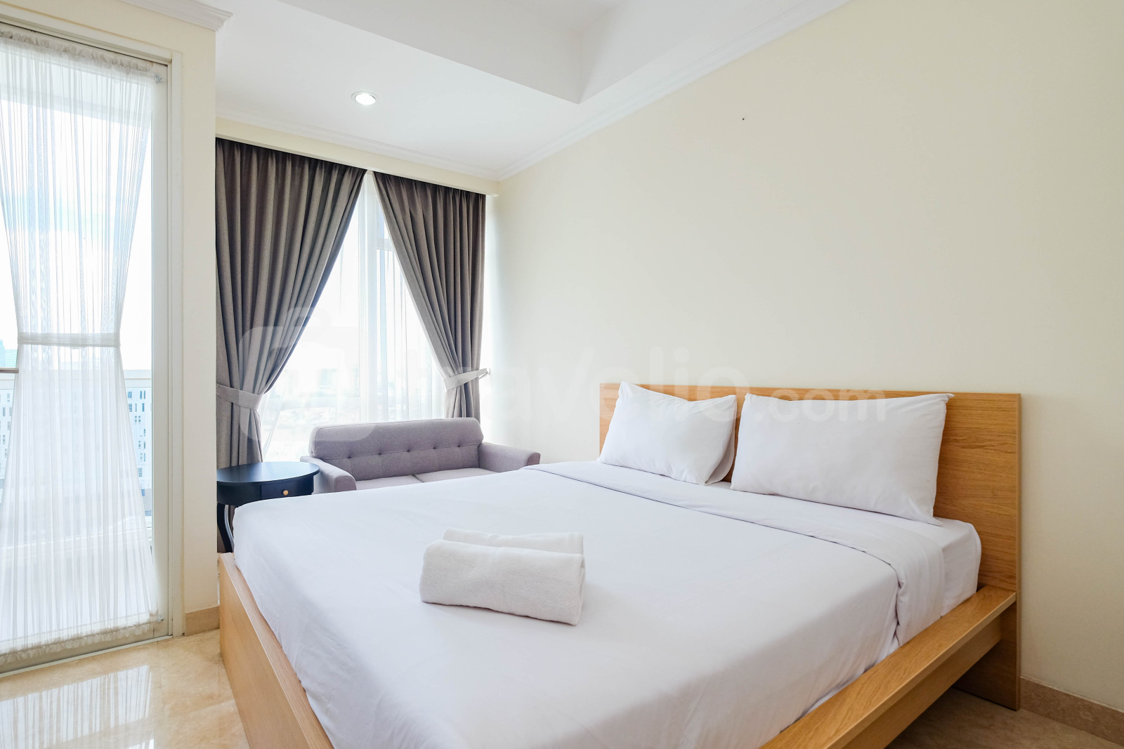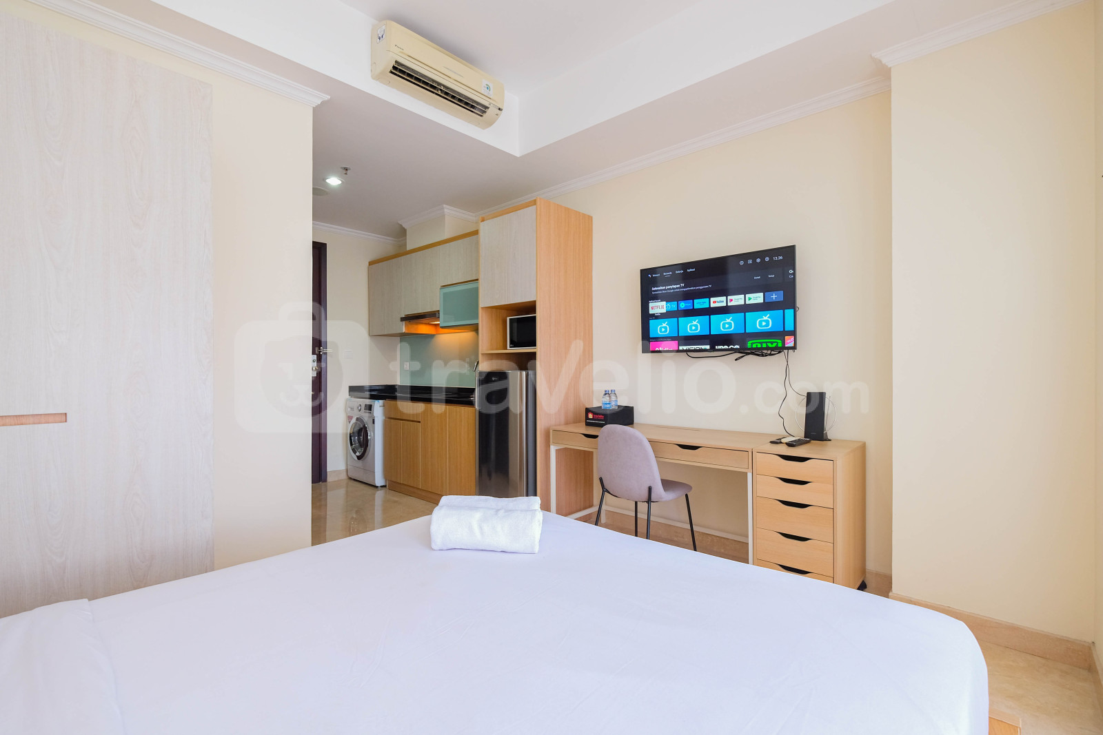 Perkenalkan, Modern Look Studio Room Menteng Park Apartment By Travelio. Studio ini menampilkan kamar tidur yang nyaman, kamar mandi yang lengkap dengan peralatan modern, dan luas 28 meter persegi.