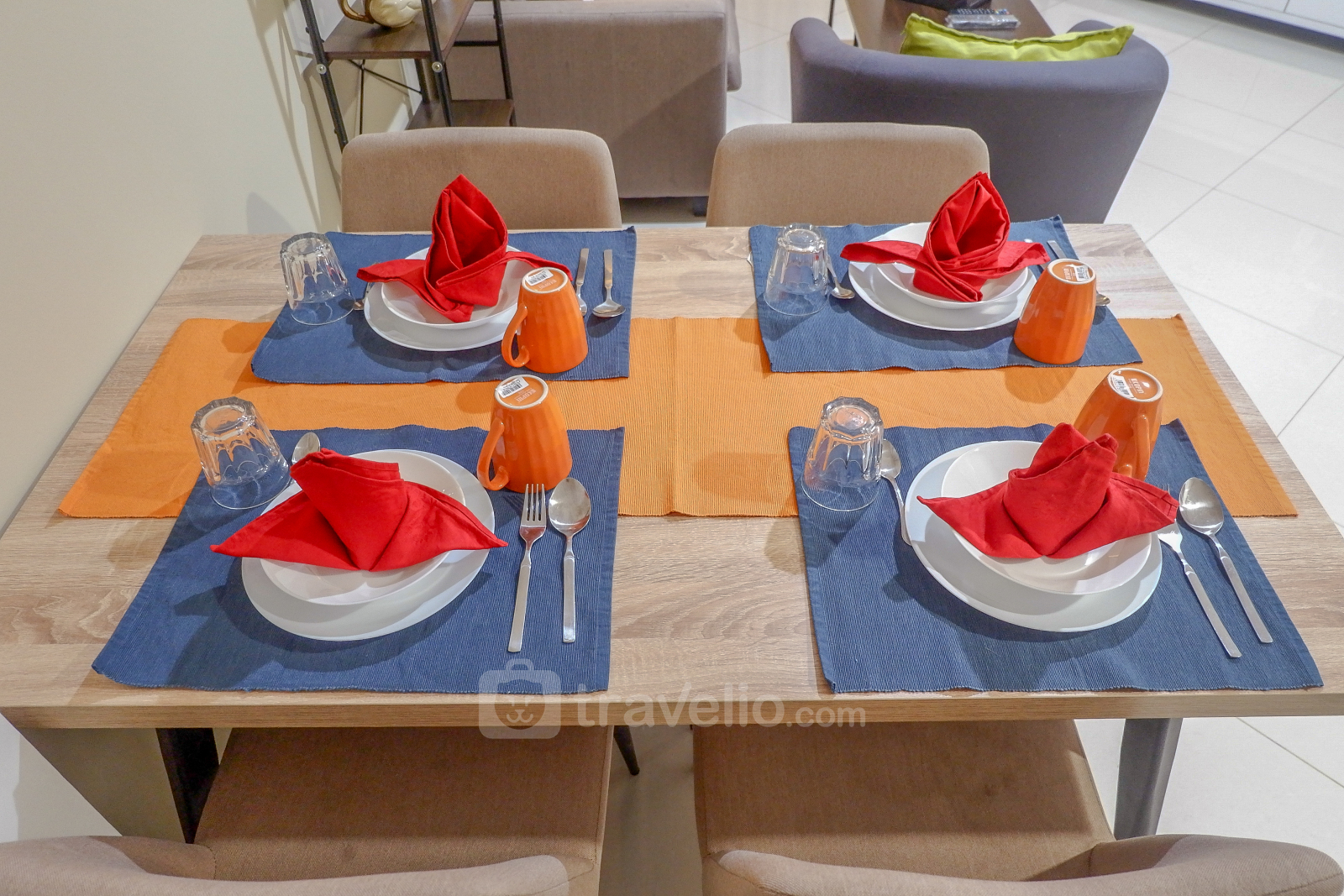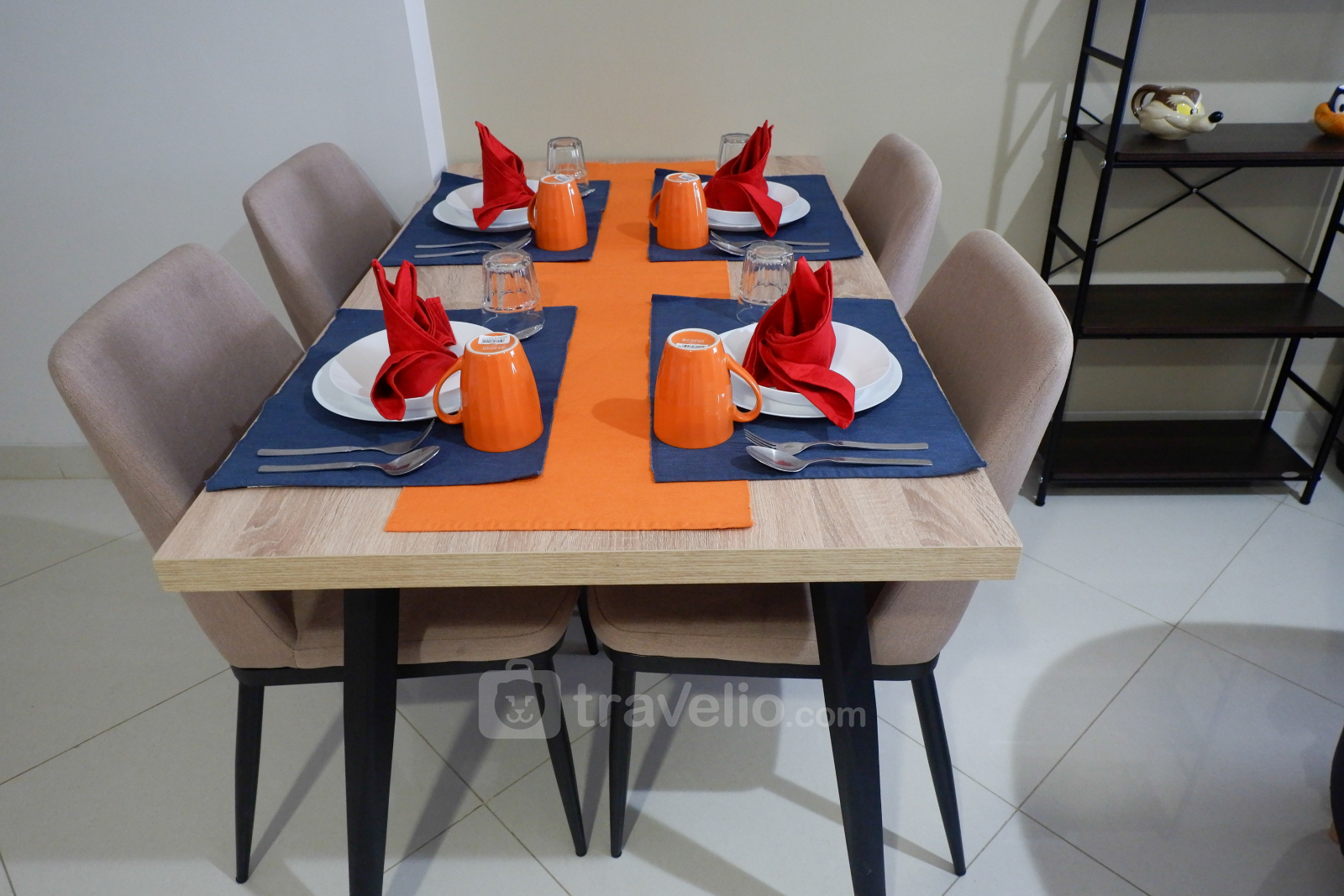 Dapurnya bernuansa putih dengan desain minimalis. Ruangnya pun dilengkapi berbagai peralatan masak seperti kompor gas, rice cooker, microwave, dan teko listrik. Bagi Anda yang ingin menjamu teman, disediakan meja makan dengan kapasitas empat orang.