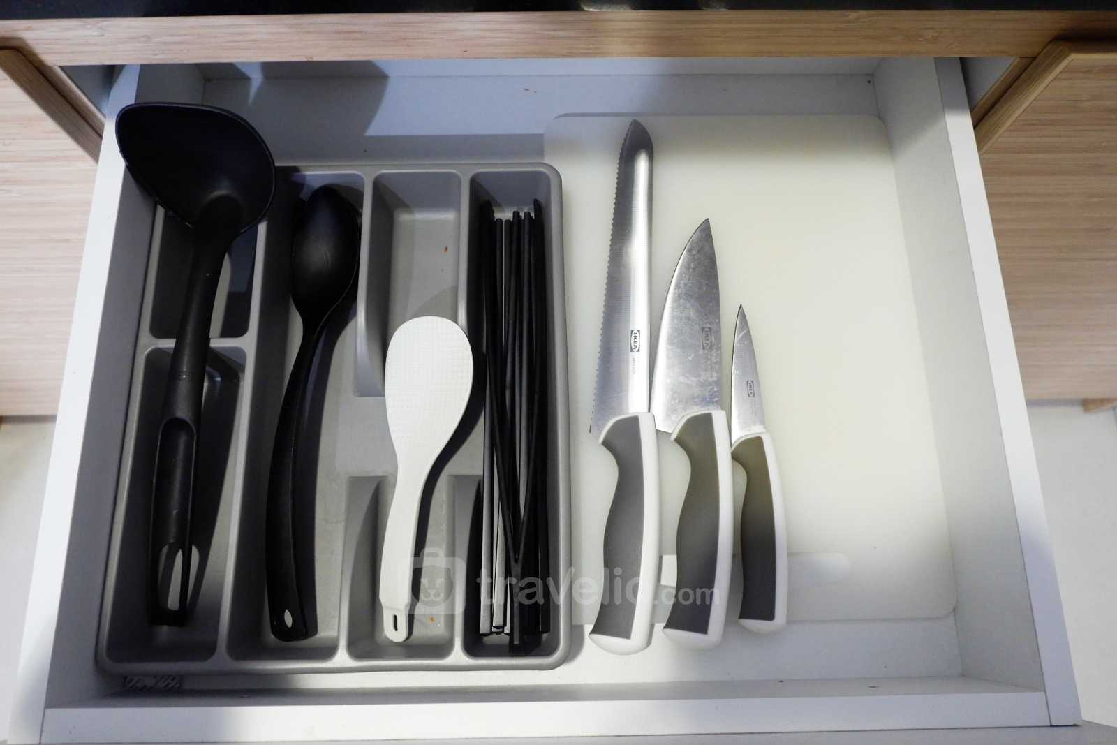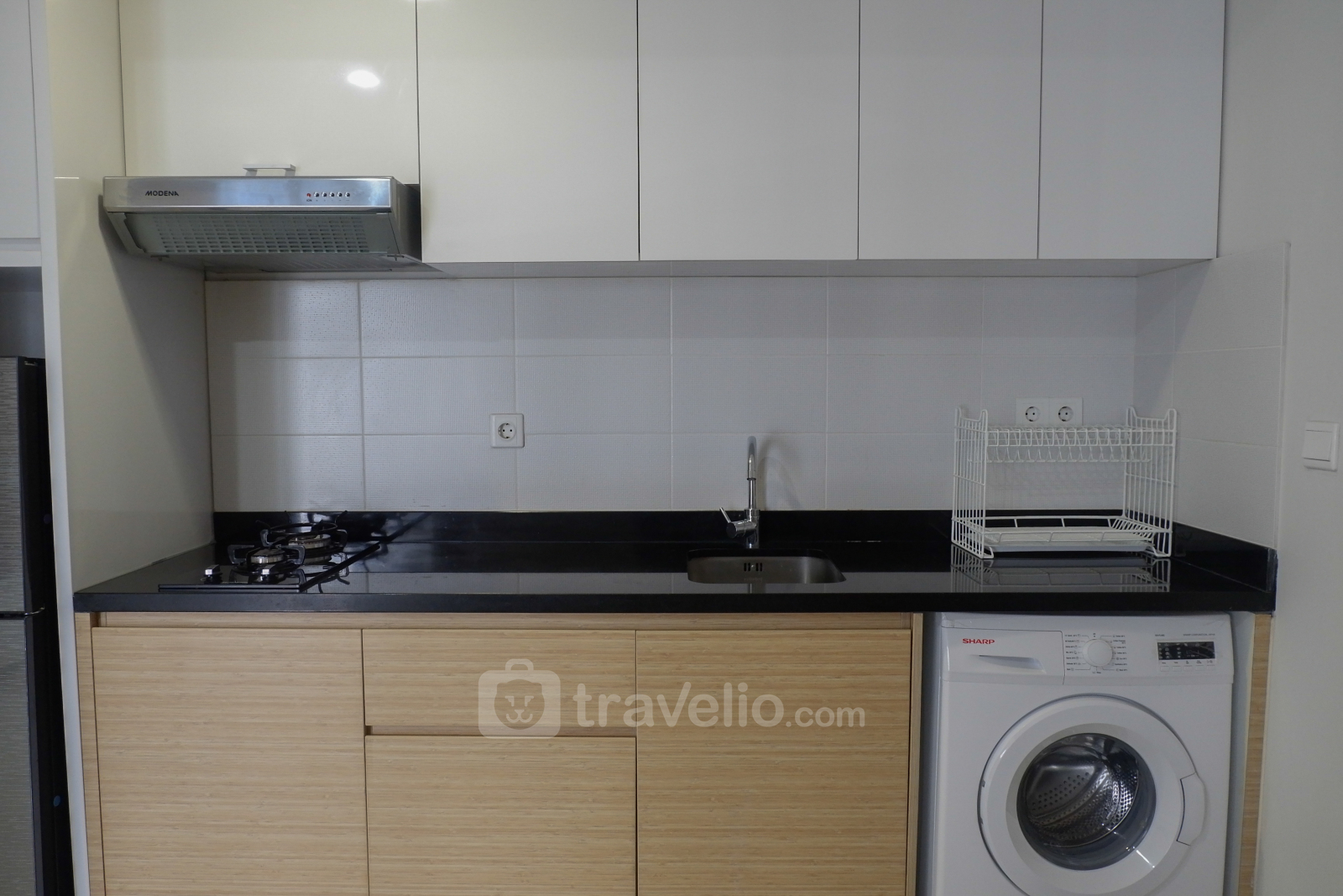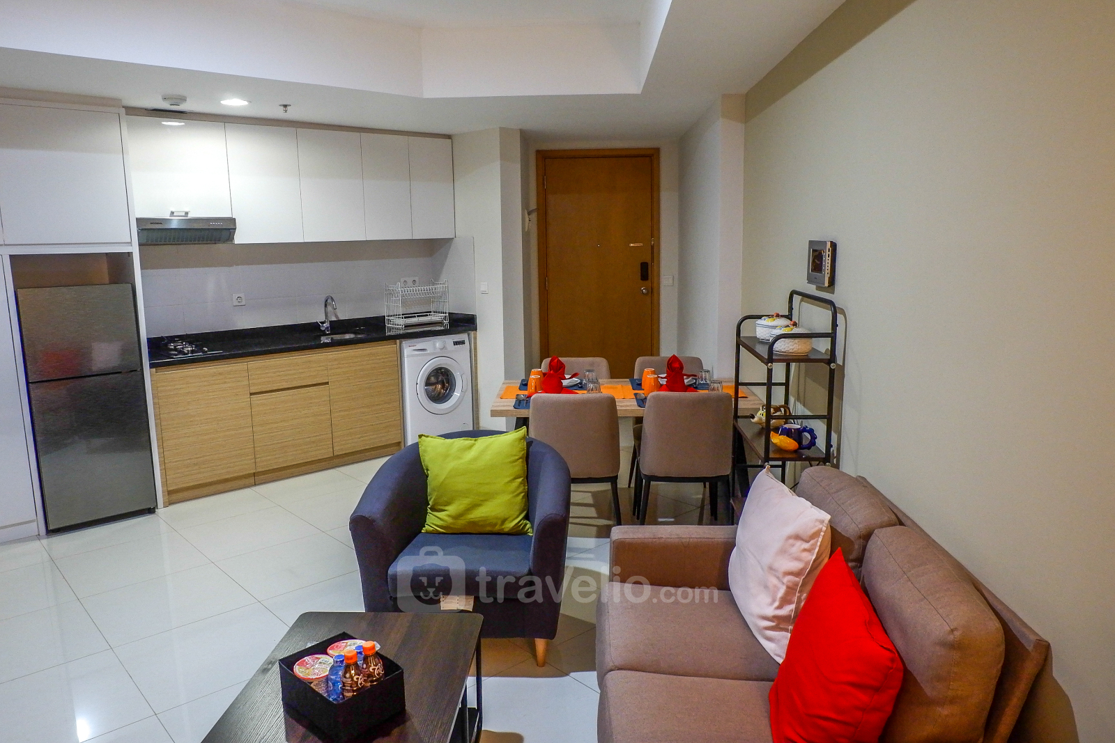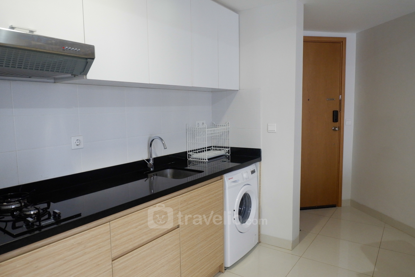 Dapurnya lengkap dengan berbagai peralatan masak dan makan sederhana dari kompor gas, rice cooker, microwave, dan teko listrik. Mesin cuci juga tersedia di dalam unit apartemen. Sementara perlengkapan mandi dan pemanas air disediakan di dalam kamar mandi.