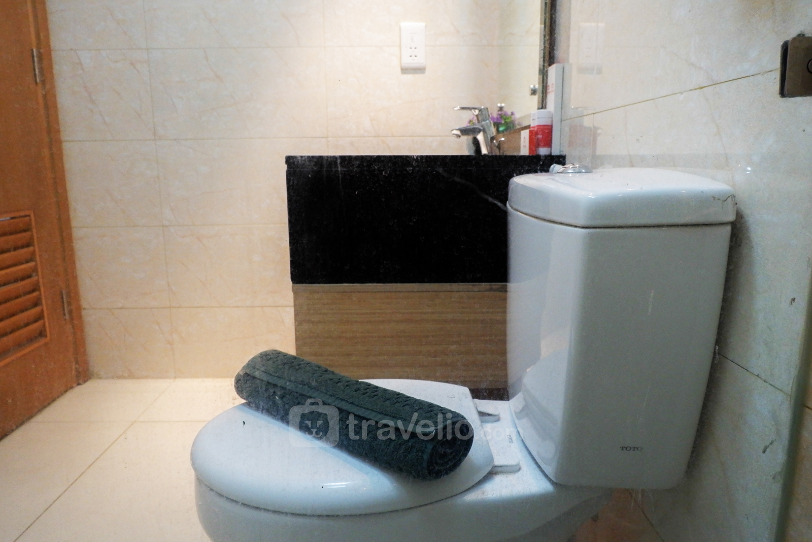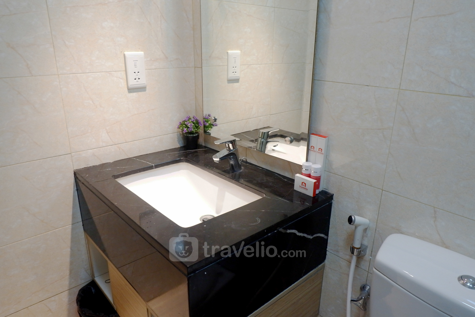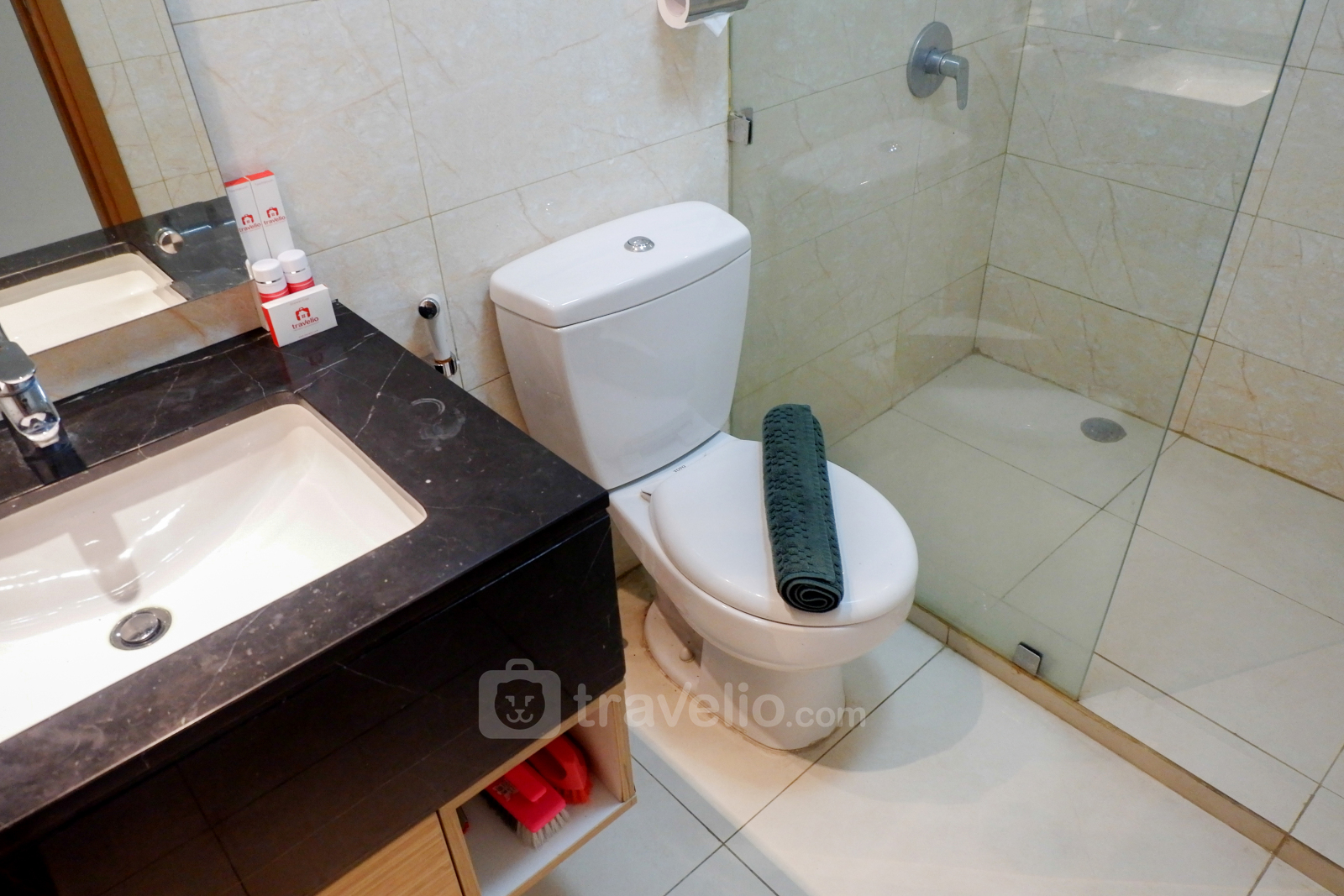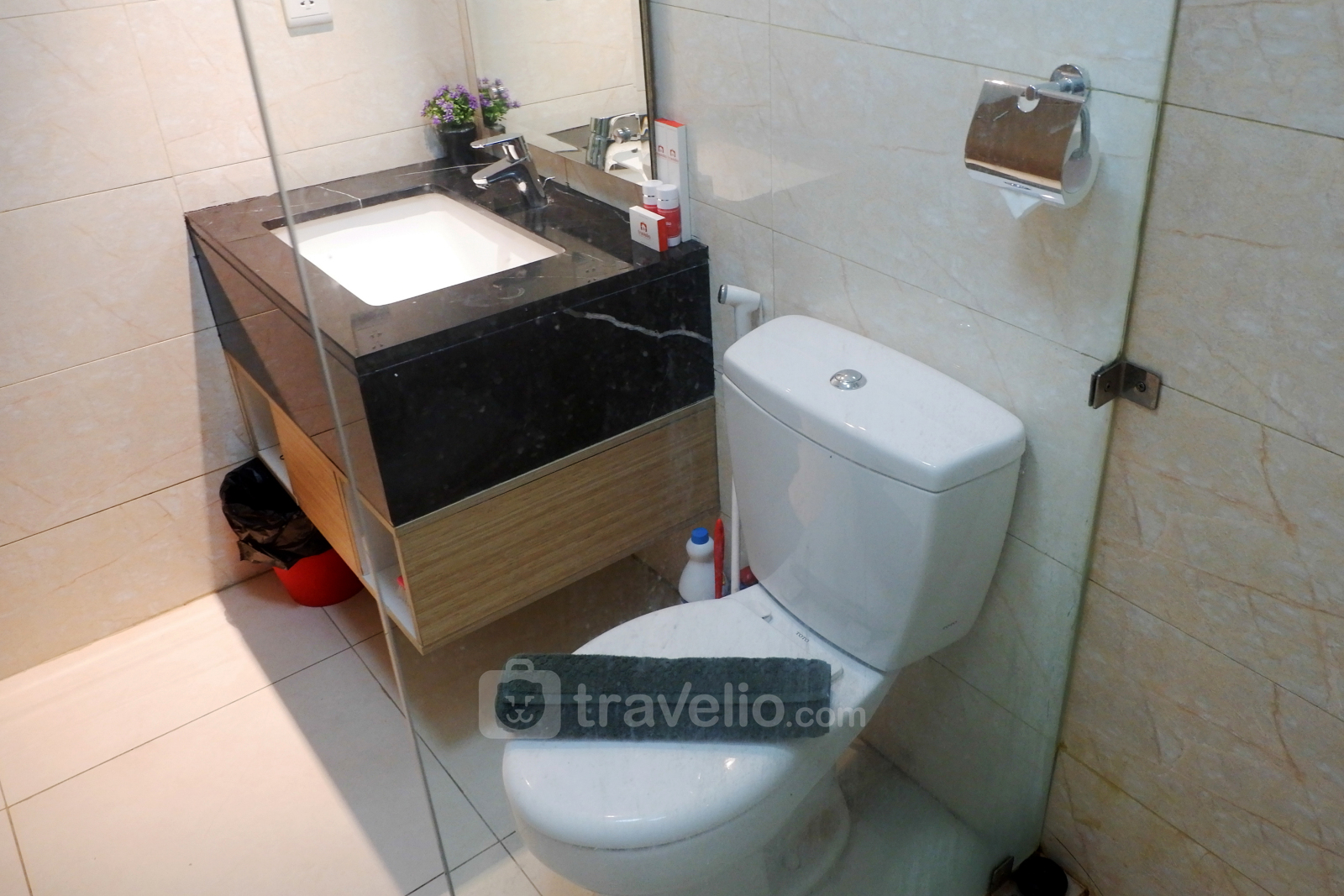 Terdapat pula satu kamar mandi lengkap dengan peralatan mandi, handuk, dan pemanas air. Anda juga tidak perlu takut dengan baju kotor karena tersedia mesin cuci di dalam unit apartemen ini.