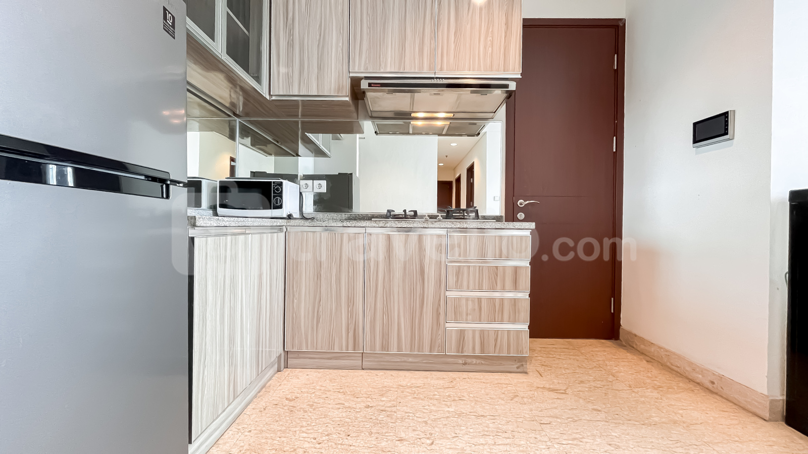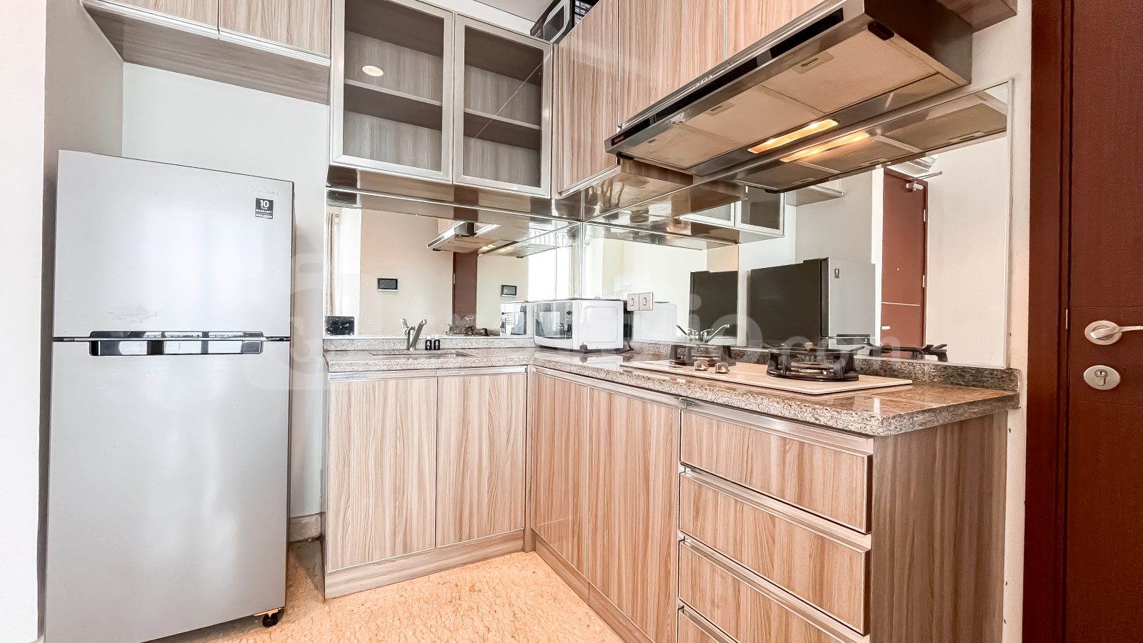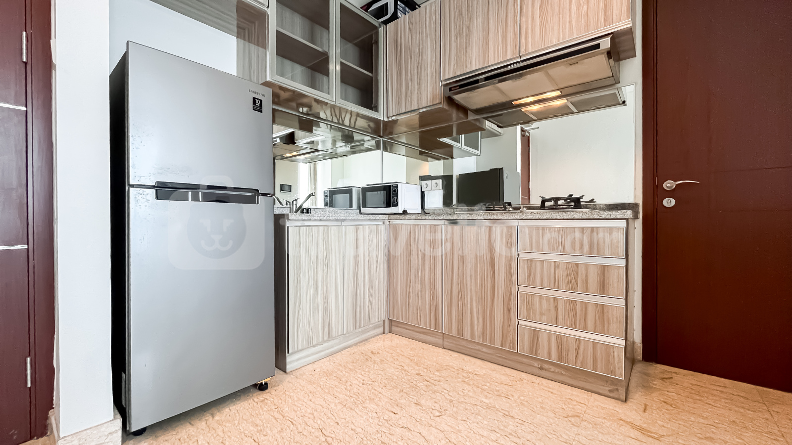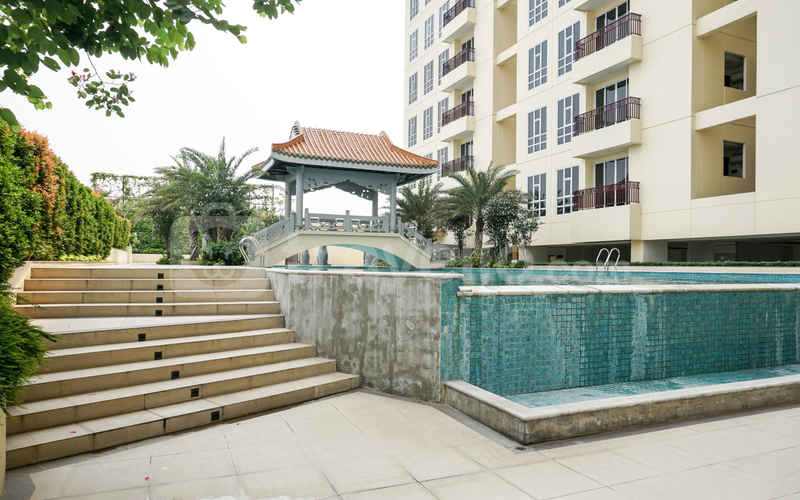Unit ini sudah dilengkapi dengan peralatan rumah tangga penting seperti TV, kulkas, microwave, water heater, dan mesin cuci, sehingga siap langsung huni. Fasilitas gedung yang tersedia antara lain keamanan 24 jam, akses kartu, lift, pusat kebugaran, dan kolam renang.