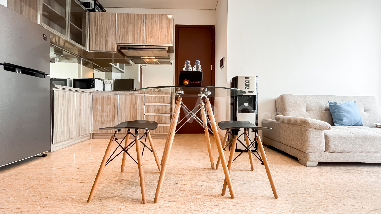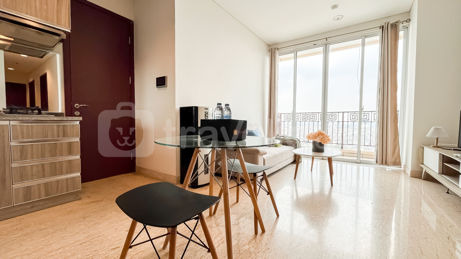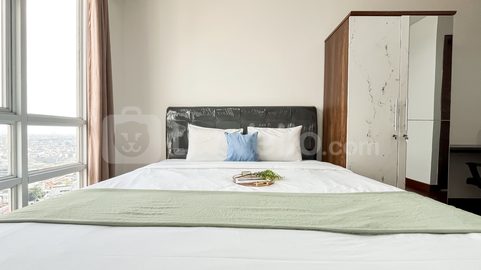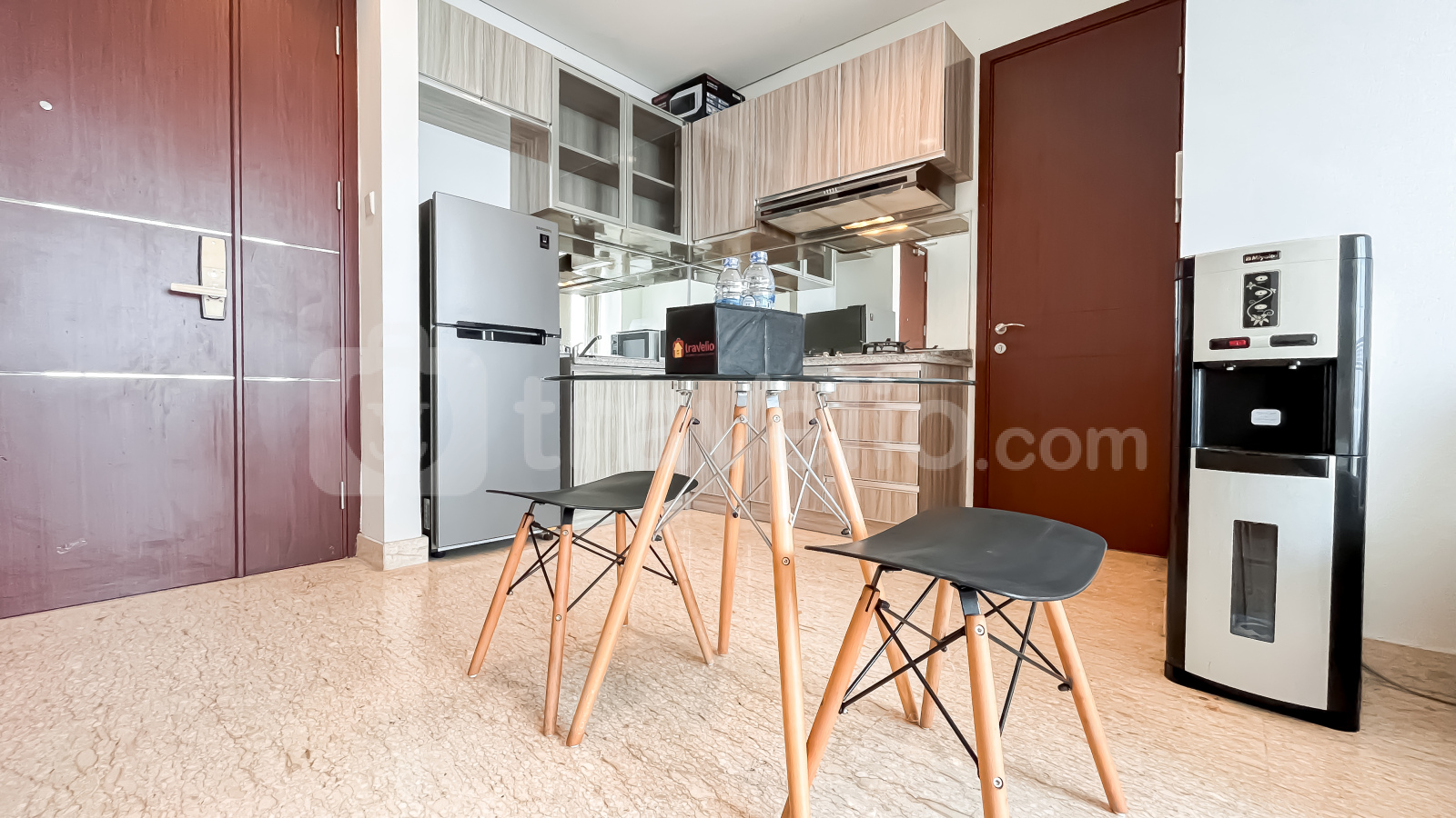 Unit ini sudah dilengkapi dengan peralatan rumah tangga penting seperti TV, kulkas, microwave, water heater, dan mesin cuci, sehingga siap langsung huni. Fasilitas gedung yang tersedia antara lain keamanan 24 jam, akses kartu, lift, pusat kebugaran, dan kolam renang.