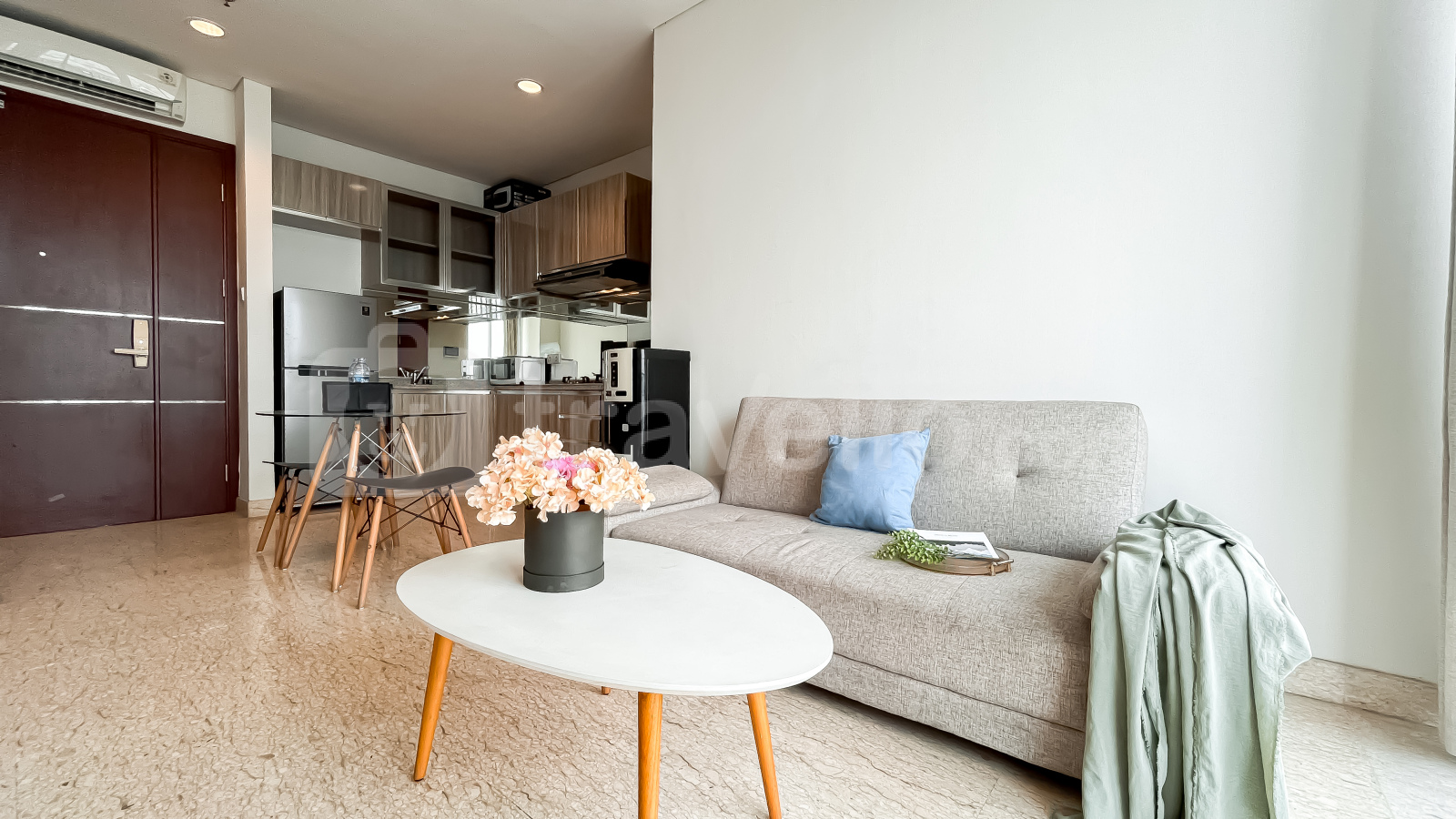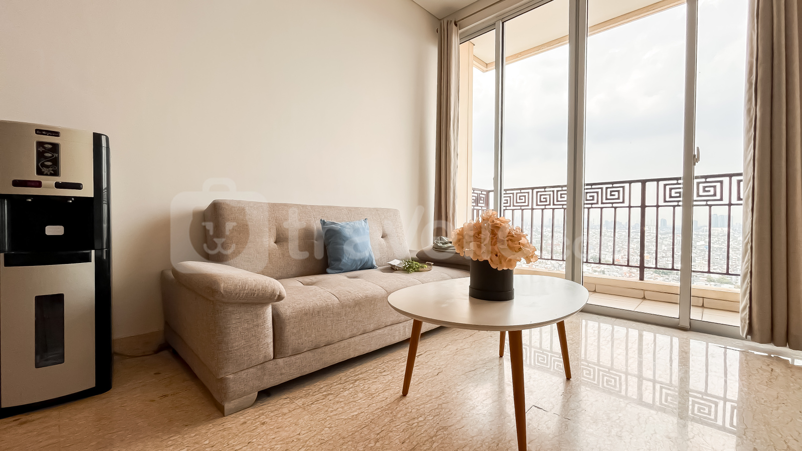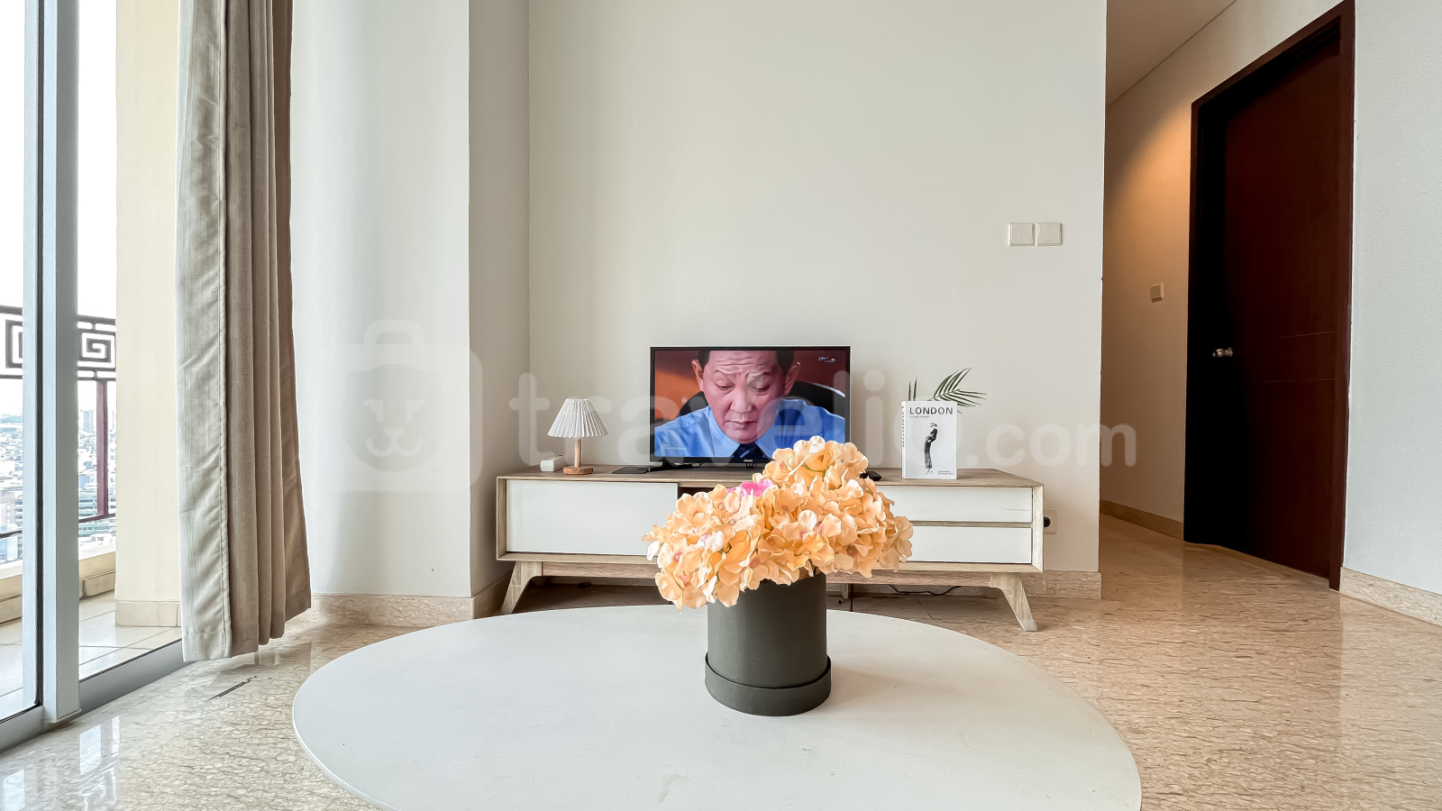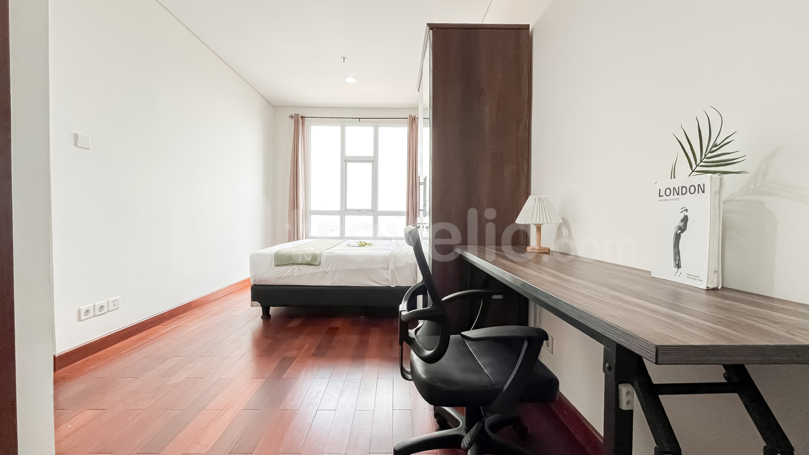 Unit ini sudah dilengkapi dengan peralatan rumah tangga penting seperti TV, kulkas, microwave, water heater, dan mesin cuci, sehingga siap langsung huni. Fasilitas gedung yang tersedia antara lain keamanan 24 jam, akses kartu, lift, pusat kebugaran, dan kolam renang.