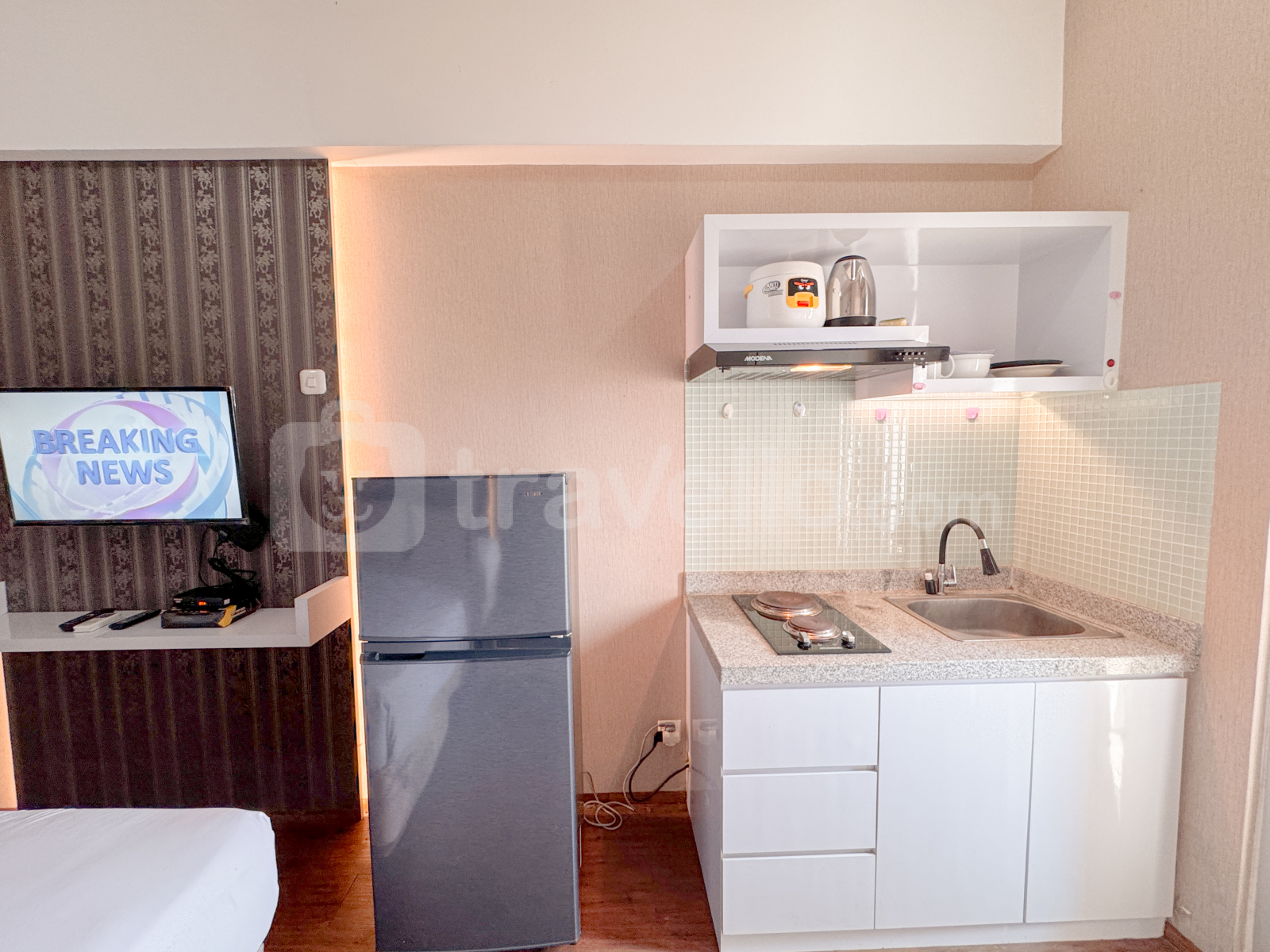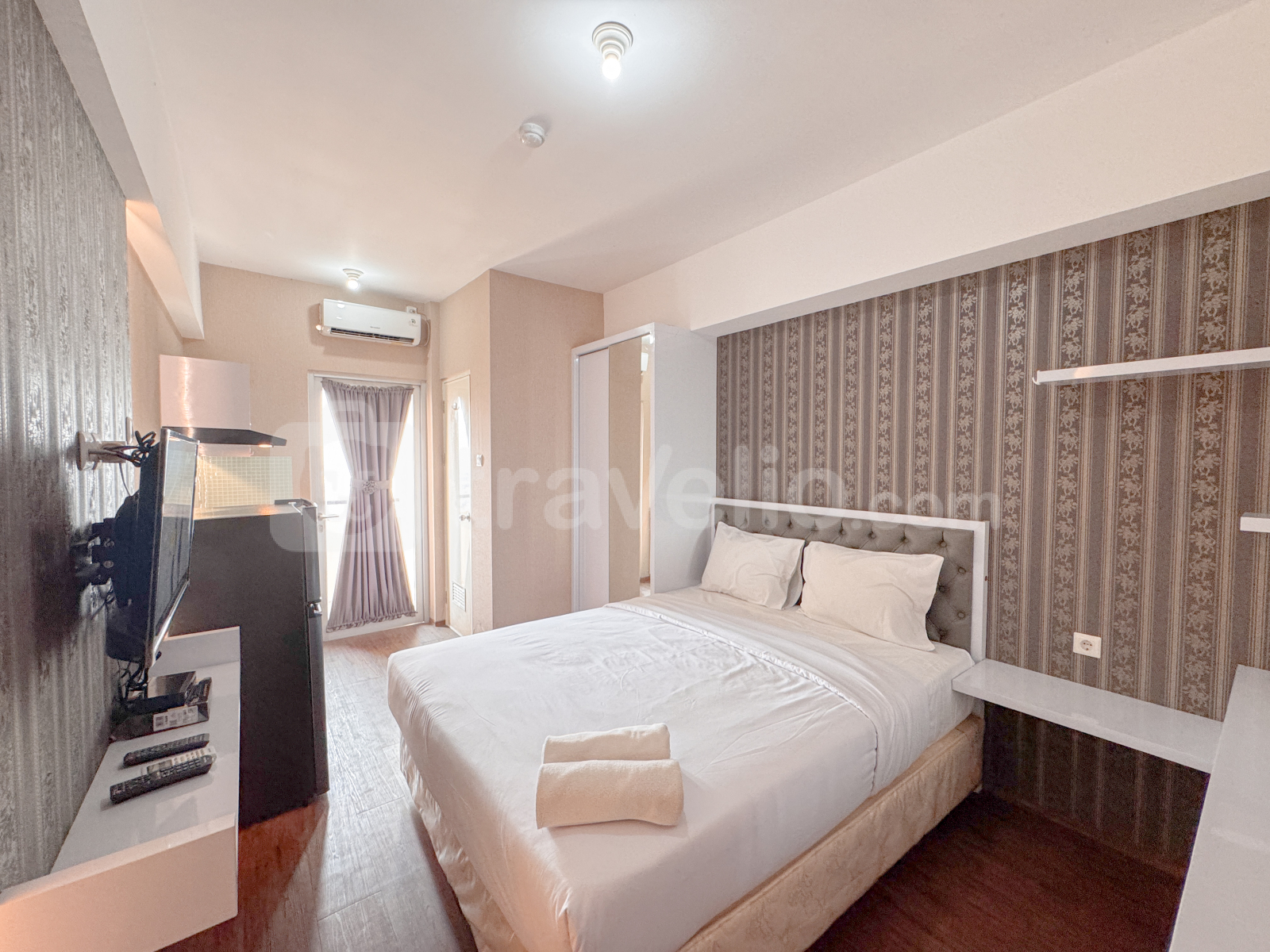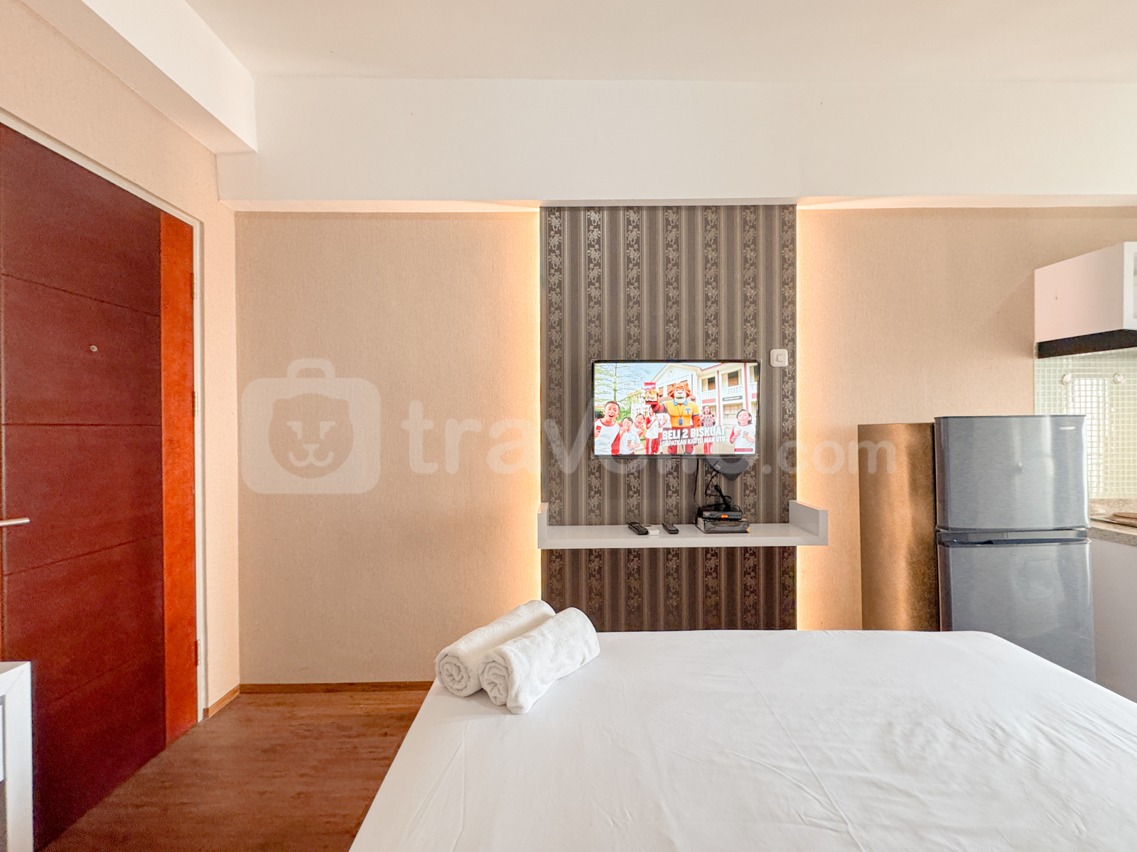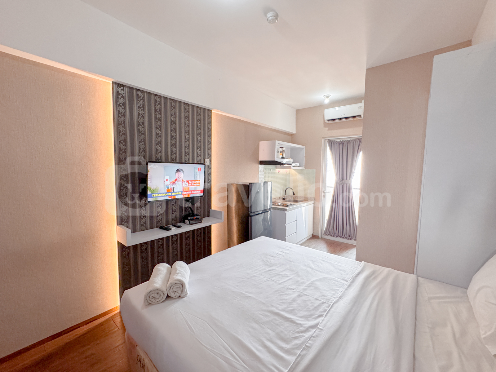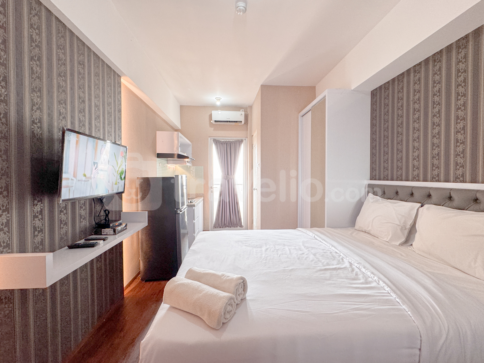 Unit studio di Apartemen Gunawangsa Tidar ini menawarkan hunian yang nyaman dengan fasilitas modern seperti TV dan kulkas, cocok untuk individu yang mencari tempat tinggal praktis dan nyaman di Bubutan, Surabaya.