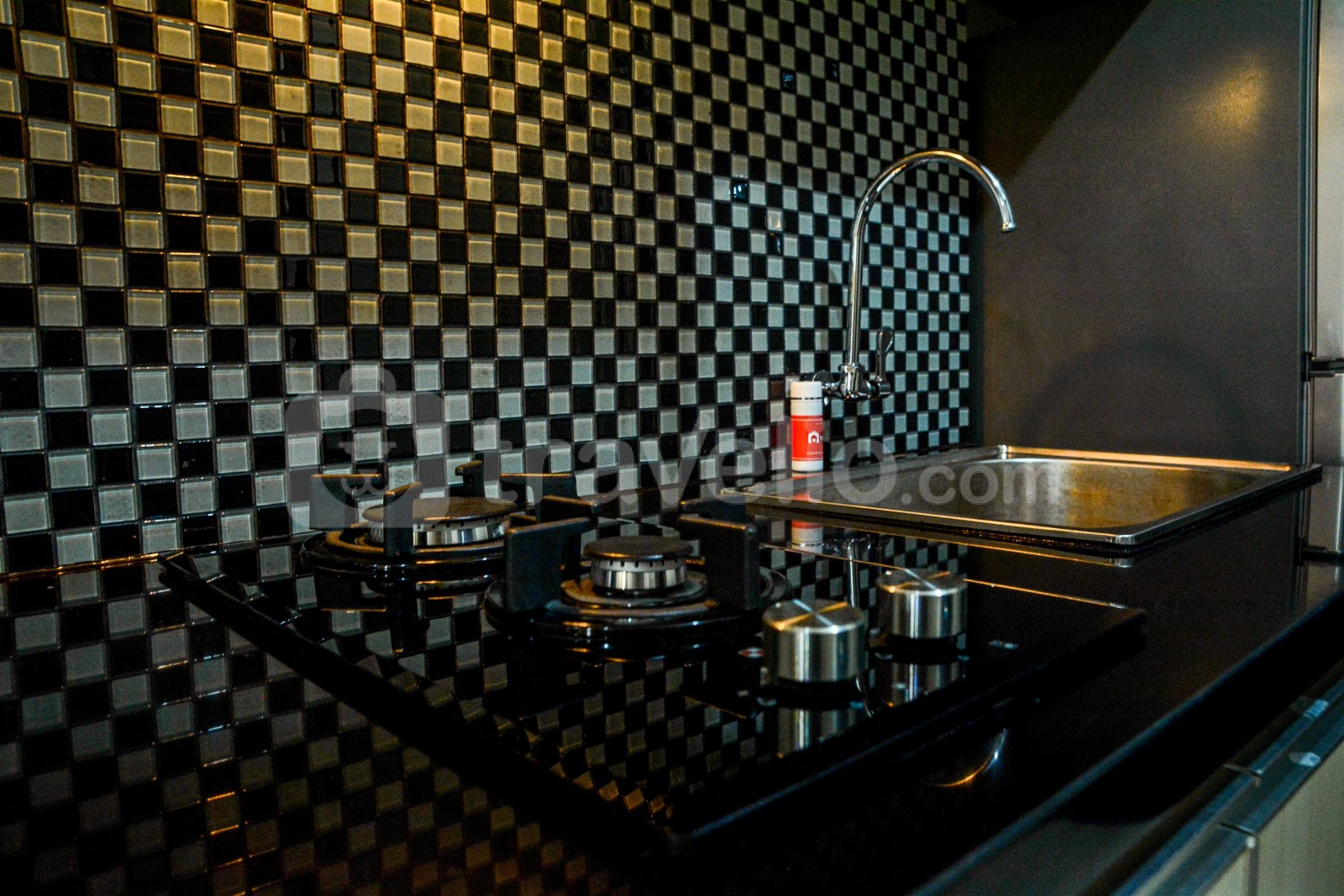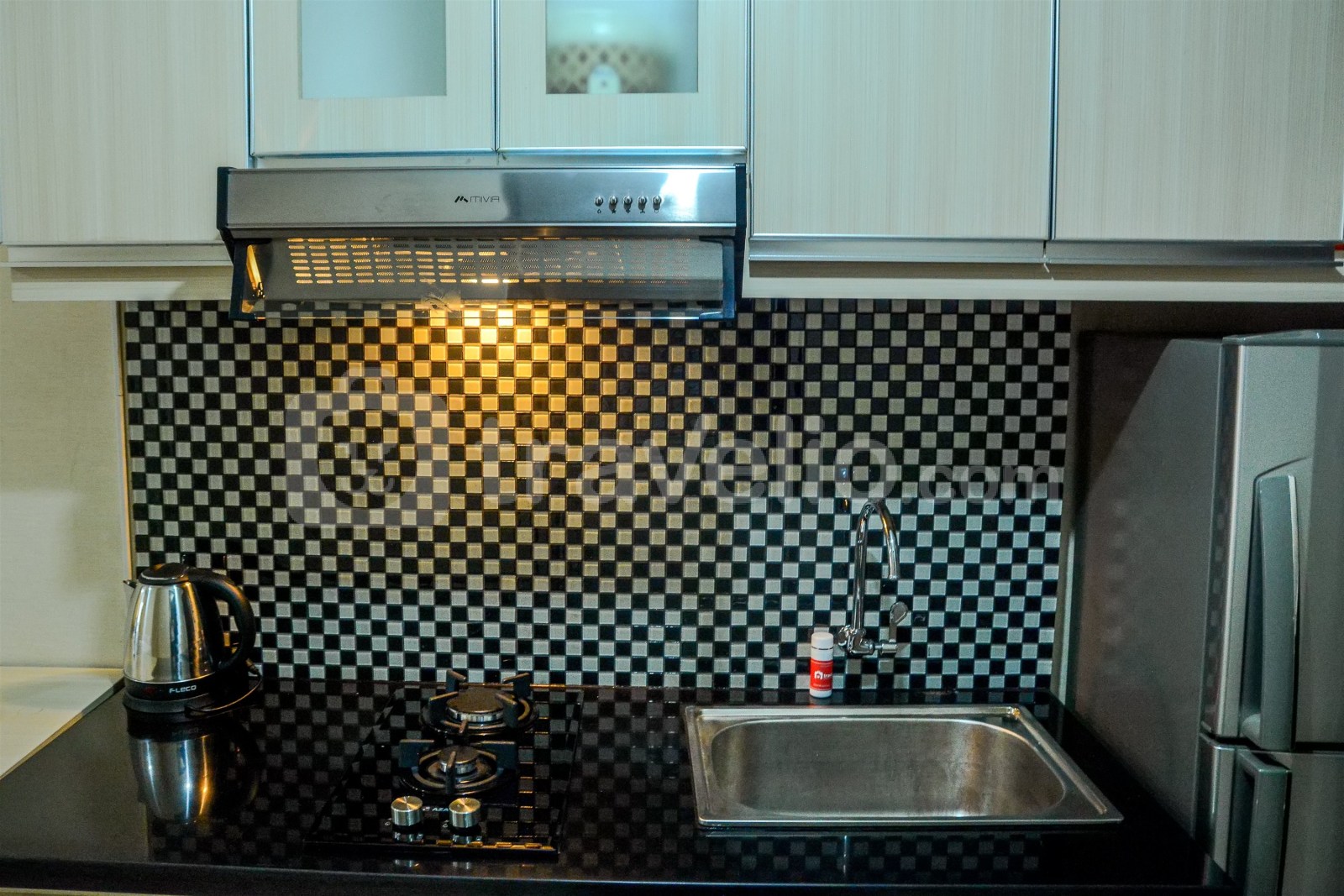 Ketika Anda memasuki ruang apartemen ini, Anda bisa melihat satu kasur berukuran queen, pendingin ruangan, serta TV set yang disediakan untuk Anda bersantai sambil menonton film. Terdapat juga dapur dengan desain interior hitam putih yang dilengkapi dengan kitchen set, kompor gas, kulkas serta peralatan masak dan makan lainnya. Satu kamar mandi tersedia di unit apartemen ini yang dilengkapi dengan shower, pemanas air, dan perlengkapan mandi lainnya.